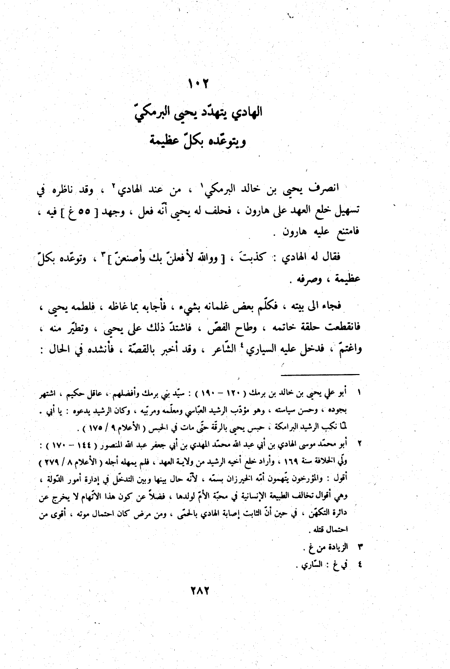فَقَالَ لَهُ الْهَادِي: كذبت، وَوَاللَّه لَأَفْعَلَنَّ بك وأصنعن، وتوعده بِكُل عَظِيمَة، وَصَرفه.