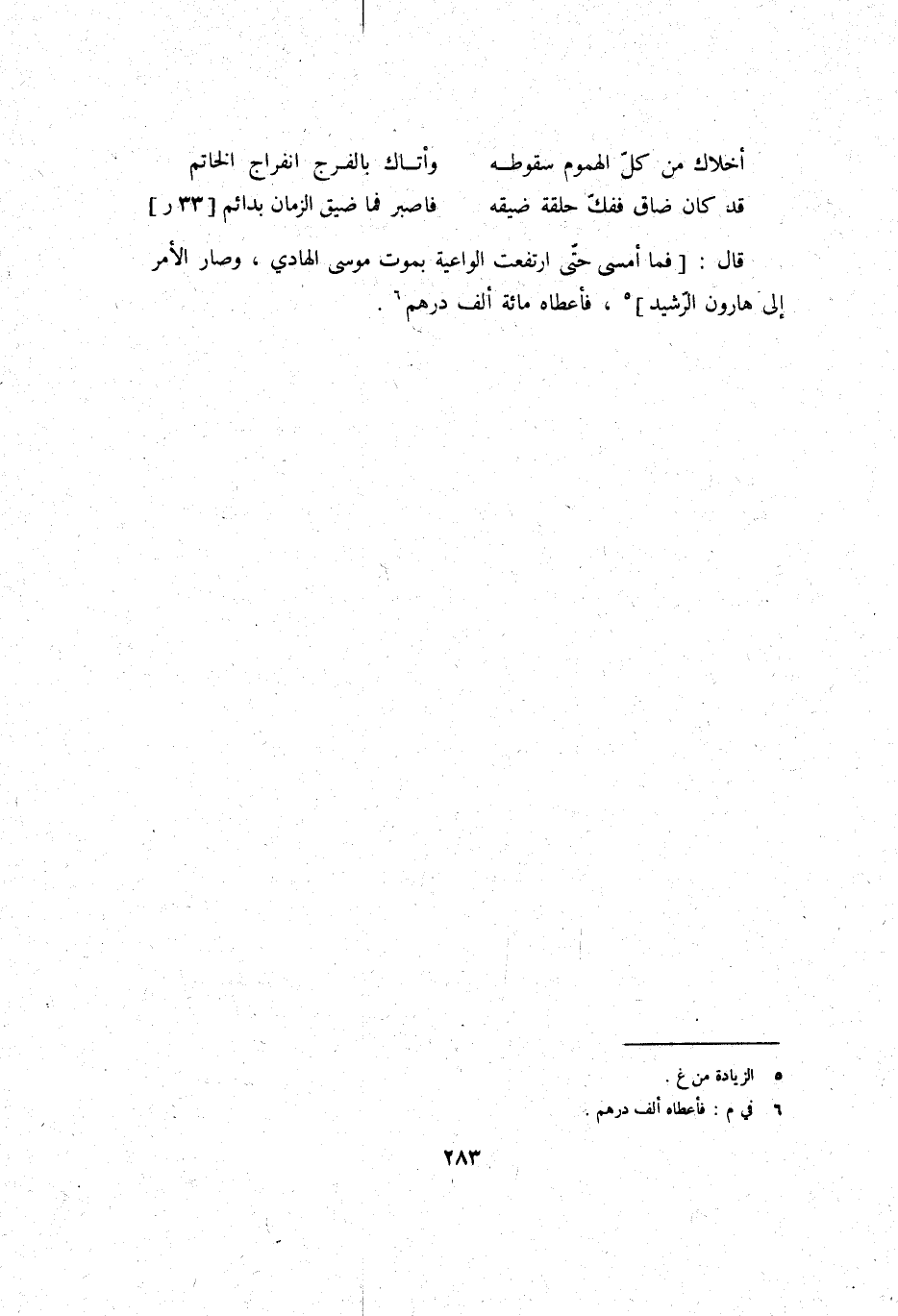 قَالَ: فَمَا أَمْسَى حَتَّى ارْتَفَعت الواعية بِمَوْت مُوسَى الْهَادِي، وَصَارَ الْأَمر إِلَى هَارُون الرشيد، فَأعْطَاهُ مائَة ألف دِرْهَم.