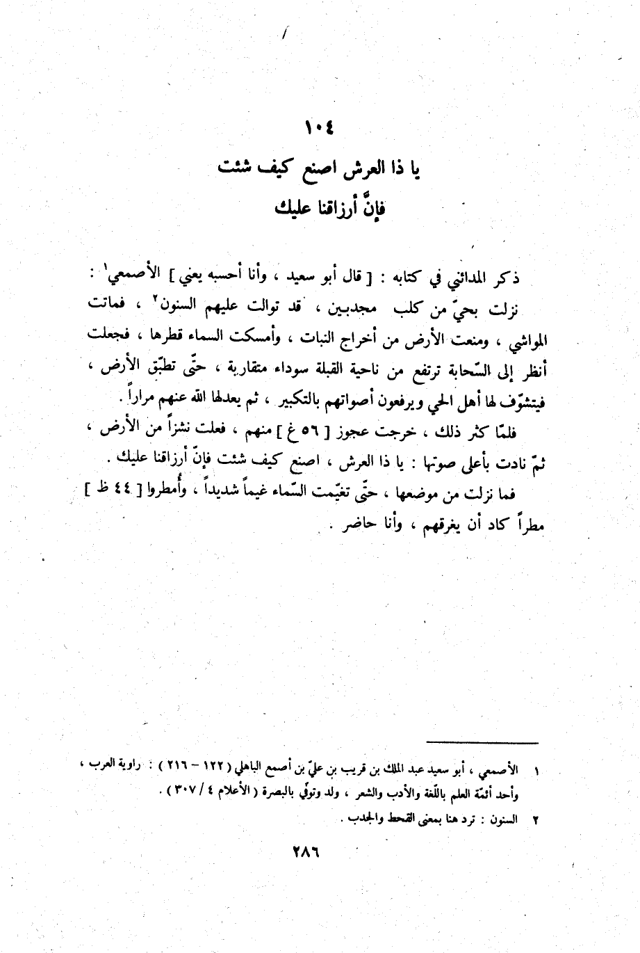 ذكر الْمَدَائِنِي فِي كِتَابه: قَالَ: أَبُو سعيد، وَأَنا أَحْسبهُ يَعْنِي الْأَصْمَعِي: نزلت بحي من كلب مجدبين، قد توالت عَلَيْهِم السنون، فَمَاتَتْ الْمَوَاشِي، ومنعت الأَرْض من إِخْرَاج النَّبَات، وَأَمْسَكت السَّمَاء قطرها، فَجعلت أنظر إِلَى السحابة ترْتَفع من نَاحيَة الْقبْلَة سَوْدَاء مُتَقَارِبَة، حَتَّى تطبق الأَرْض، فيتشوف لَهَا أهل الْحَيّ ويرفعون أَصْوَاتهم بِالتَّكْبِيرِ، ثمَّ يعدلها الله عَنْهُم مرَارًا.