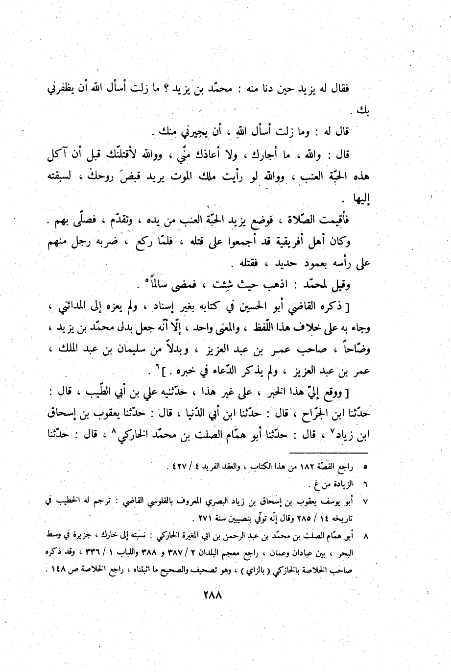 ذكره القَاضِي أَبُو الْحُسَيْن فِي كِتَابه بِغَيْر إِسْنَاد، وَلم يعزه إِلَى الْمَدَائِنِي، وَجَاء بِهِ على خلاف هَذَا اللَّفْظ، وَالْمعْنَى وَاحِد، إِلَّا أَنه جعل بدل مُحَمَّد بن يزِيد، وضاحا، صَاحب عمر بن عبد الْعَزِيز، وبدلا من سُلَيْمَان بن عبد الْملك، عمر بن عبد الْعَزِيز، وَلم يذكر الدُّعَاء فِي خَبره. . وَوَقع إِلَيّ هَذَا الْخَبَر، على غير هَذَا، حَدَّثَنِيهِ عَليّ بن أبي الطّيب، قَالَ: حَدَّثَنَا ابْن الْجراح، قَالَ: حَدَّثَنَا ابْن أبي الدُّنْيَا، قَالَ: حَدَّثَنَا يَعْقُوب بن إِسْحَاق بن زِيَاد، قَالَ: حَدَّثَنَا أَبُو همام الصَّلْت بن مُحَمَّد الخاركي، قَالَ: حَدَّثَنَا