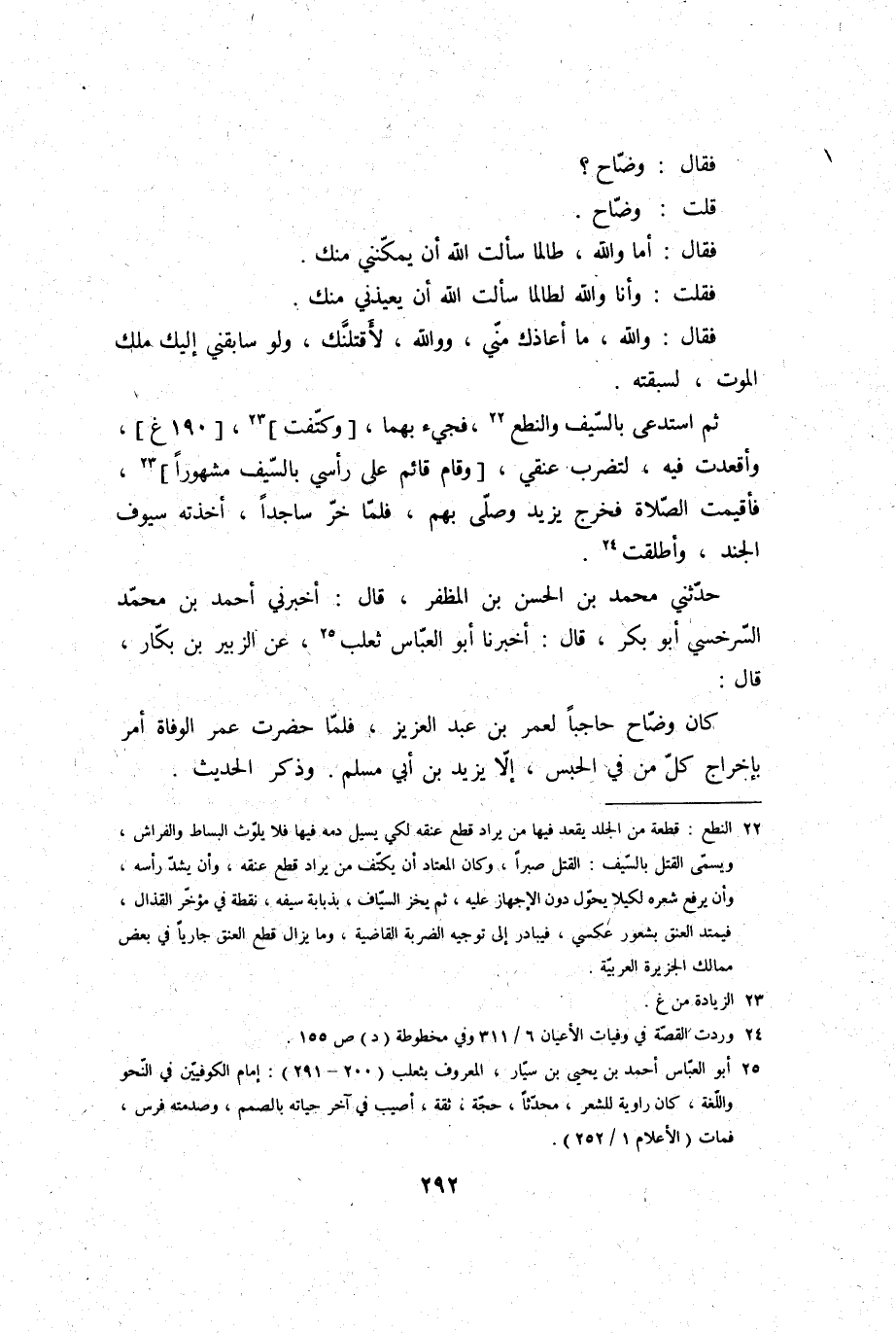 حَدثنِي مُحَمَّد بن الْحسن بن المظفر، قَالَ: أَخْبرنِي أَحْمد بن مُحَمَّد السَّرخسِيّ أَبُو بكر، قَالَ: أخبرنَا أَبُو الْعَبَّاس ثَعْلَب، عَن الزبير بن بكار، قَالَ: كَانَ وضاح حاجبا لعمر بن عبد الْعَزِيز، فَلَمَّا حضرت عمر الْوَفَاة أَمر بِإِخْرَاج كل من فِي الْحَبْس، إِلَّا يزِيد بن أبي مُسلم.