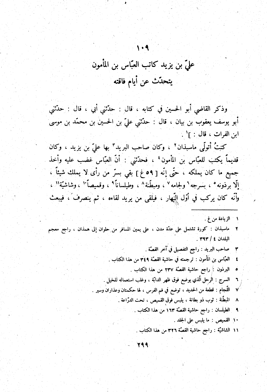 قَالَ: حَدثنِي أبي، قَالَ: حَدثنِي أَبُو يُوسُف يَعْقُوب بن بَيَان، قَالَ: حَدثنِي عَليّ بن الْحُسَيْن بن مُحَمَّد بن مُوسَى بن الْفُرَات، قَالَ: كنت أتولى ماسبذان، وَكَانَ صَاحب الْبَرِيد بهَا عَليّ بن يزِيد، وَكَانَ قَدِيما يكْتب للْعَبَّاس بن الْمَأْمُون، فَحَدثني: أَن الْعَبَّاس غضب عَلَيْهِ وَأخذ جَمِيع مَا كَانَ يملكهُ، حَتَّى إِنَّه بَقِي بسر من رأى لَا يملك شَيْئا، إِلَّا برذونه، بسرجه ولجامه، ومبطنة، وطيلسانا، وقميصا، وشاشية، وَأَنه كَانَ يركب فِي أول النَّهَار، فَيلقى من يُرِيد لقاءه، ثمَّ ينْصَرف، فيبعث