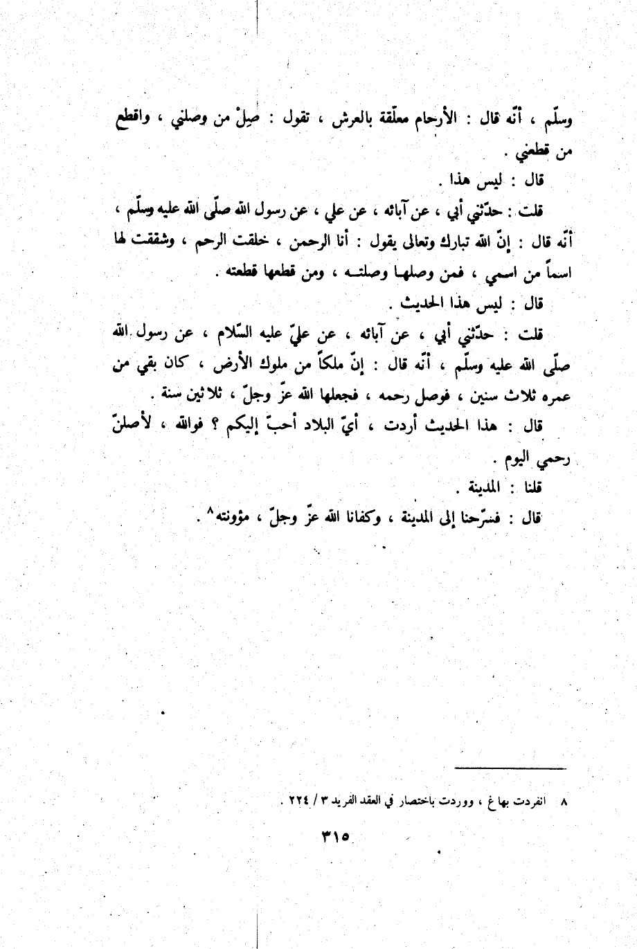 1: 315 49 - قُلْتُ: حَدَّثَنِي أَبِي، عَنْ آبَائِهِ، عَنْ عَلِيٍّ عَلَيْهِ السَّلامُ، عَنْ رَسُولِ اللَّهِ صَلَّى اللَّهُ عَلَيْهِ وَسَلَّمَ، أَنَّهُ قَالَ: «إِنَّ §مَلِكًا مِنْ مُلُوكِ الأَرْضِ، كَانَ بَقِيَ مِنْ عُمْرِهِ ثَلاثُ سِنِينَ، فَوَصَلَ رَحِمَهُ، فَجَعَلَهَا اللَّهُ عَزَّ وَجَلَّ، ثَلاثِينَ سَنَةً» قَالَ: هَذَا الْحَدِيثُ أَرَدْتُ، أَيُّ الْبِلادِ أَحَبُّ إِلَيْكُمْ؟ فَوَاللَّهِ، لأَصِلَنَّ رَحِمِي الْيَوْمَ.