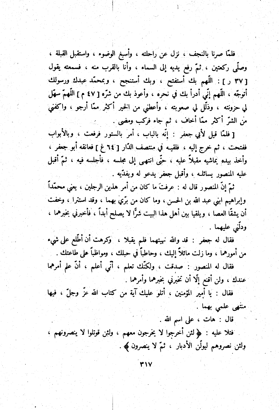 ثمَّ إِن الْمَنْصُور قَالَ لَهُ: عرفت مَا كَانَ من أَمر هذَيْن الرجلَيْن، يَعْنِي: مُحَمَّدًا وَإِبْرَاهِيم ابْني عبد الله بن الْحسن، وَمَا كَانَ من بري بهما، وَقد استترا، وَخفت أَن يشقا الْعَصَا، ويلقيا بَين أهل هَذَا الْبَيْت شرا لَا يصلح أبدا، فَأَخْبرنِي بخبرهما، ودلني عَلَيْهِمَا.