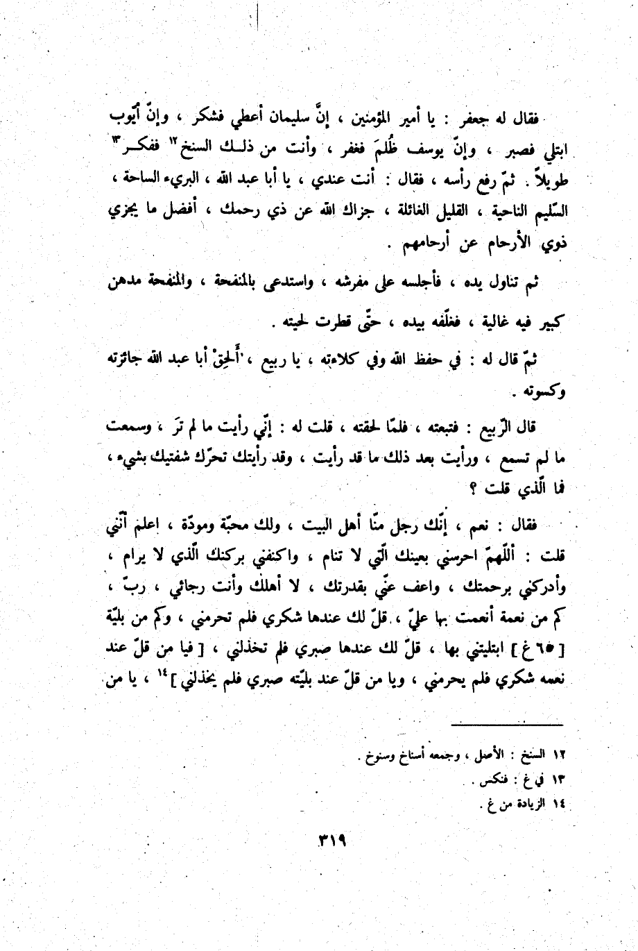 فَقَالَ لَهُ جَعْفَر: يَا أَمِير الْمُؤمنِينَ، إِن سُلَيْمَان أعطي فَشكر، وَإِن أَيُّوب ابْتُلِيَ فَصَبر، وَإِن يُوسُف ظلم فغفر، وَأَنت من ذَلِك السنخ ففكر طَويلا.