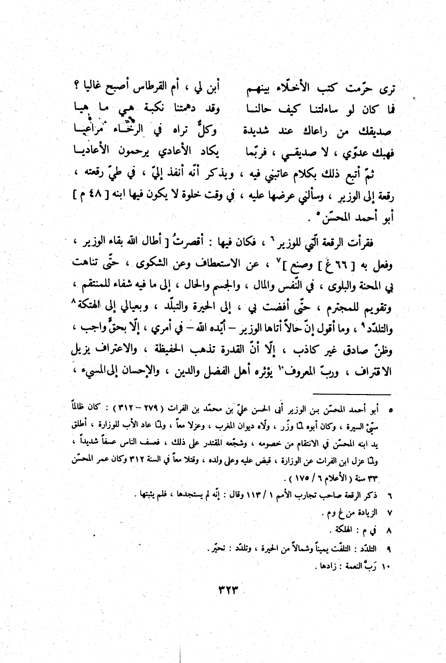 ثمَّ أتبع ذَلِك بِكَلَام عَاتَبَنِي فِيهِ، وَيذكر أَنه أنفذ إِلَيّ، فِي طي رقعته، رقْعَة إِلَى الْوَزير، وسألني عرضهَا عَلَيْهِ، فِي وَقت خلْوَة لَا يكون فِيهَا ابْنه أَبُو أَحْمد المحسن.