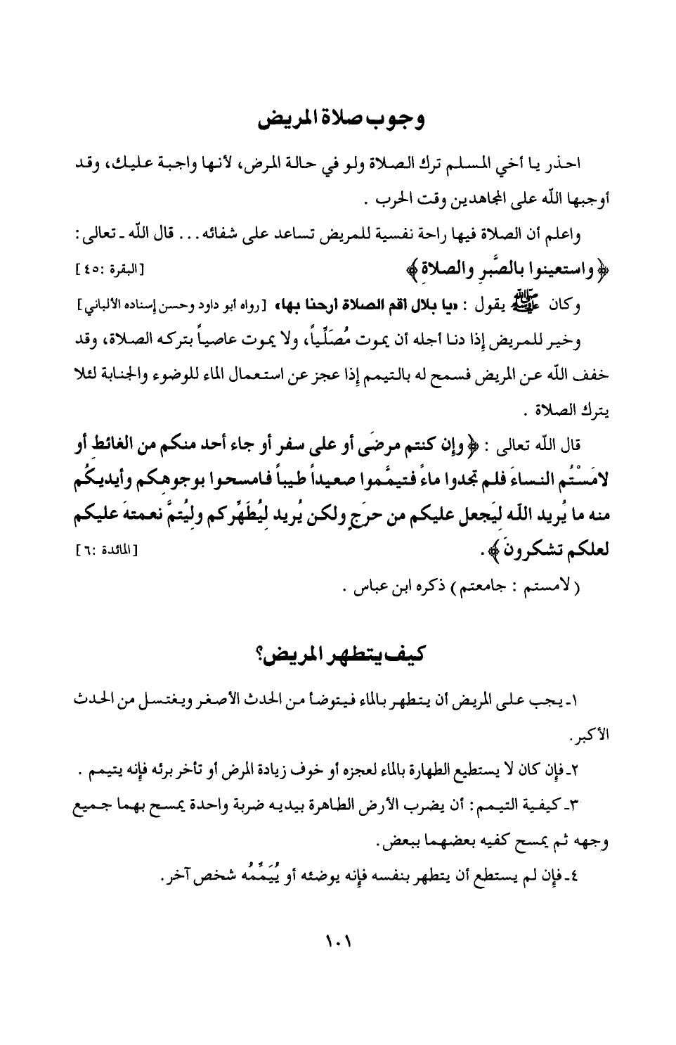 وخير للمريض إِذا دنا أجله أن يموت مُصَلِّياً، ولا يموت عاصياً بتركه الصلاة، وقد خفف الله عن المريض فسمح له بالتيمم إِذا عجز عن استعمال الماء للوضوء والجنابة لئلا يترك الصلاة.