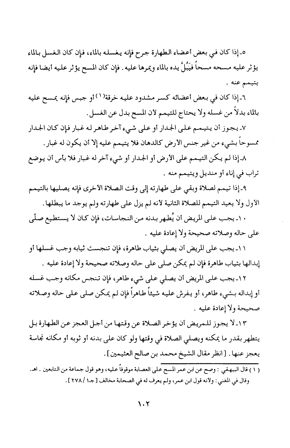 5 - إِذا كان في بعض أعضاء الطهارة جرح فإِنه يغسله بالماء، فإِن كان الغسل بالماء يؤثر عليه مسحه مسحاً فيَبُلَّ يده بالماء ويمرها عليه. فإِن كان المسح يؤثر عليه أيضاً فإِنه يتيمم عنه.
