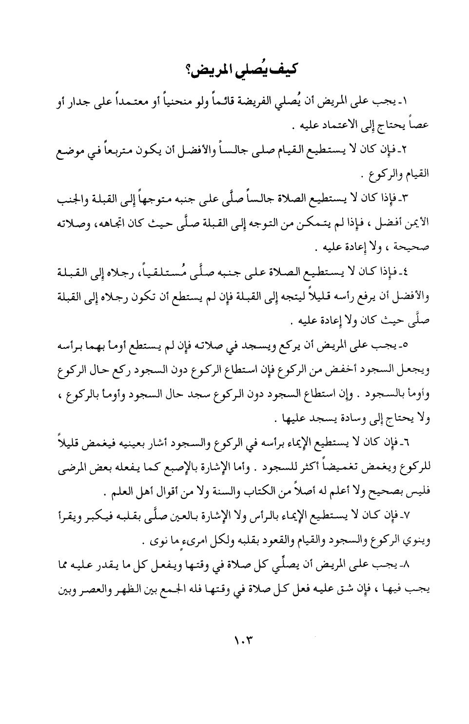 8 - يجب على المريض أن يصلِّي كل صلاة في وقتها ويفعل كل ما يقدر عليه مما يجب فيها، فإِن شق عليه فعل كل صلاة في وقتها فله الجمع بين الظهر والعصر وبين