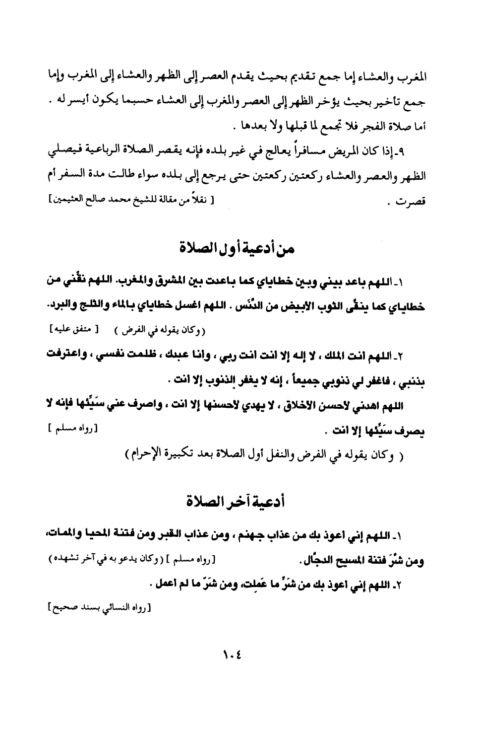 1 - اللهم باعد بيني وبين خطاياي كما باعدت بين المشرق والمغرب. اللهم نقني من خطاياي كما ينقى الثوب الأبيض من الدَّنس. اللهم اغسل خطاياي بالماء والثلج والبرد. (وكان يقوله في الفرض) [متفق عليه]