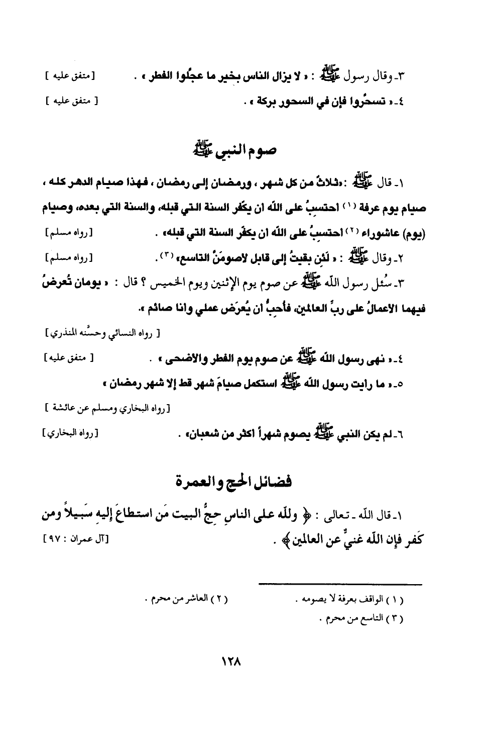 1 - قال - صلى الله عليه وسلم -: "ثلاثٌ من كل شهر، ورمضان إلى رمضان، فهذا صيام الدهر كله، صيام يوم عرفة (¬1) احتسِبُ على الله أن يكَّفر السنة التي قبله، والسنة التي بعده، وصيام (يوم) عاشوراء (¬2) احتسِبُ على الله أن يكفّر السنة التي قبله". [رواه مسلم]