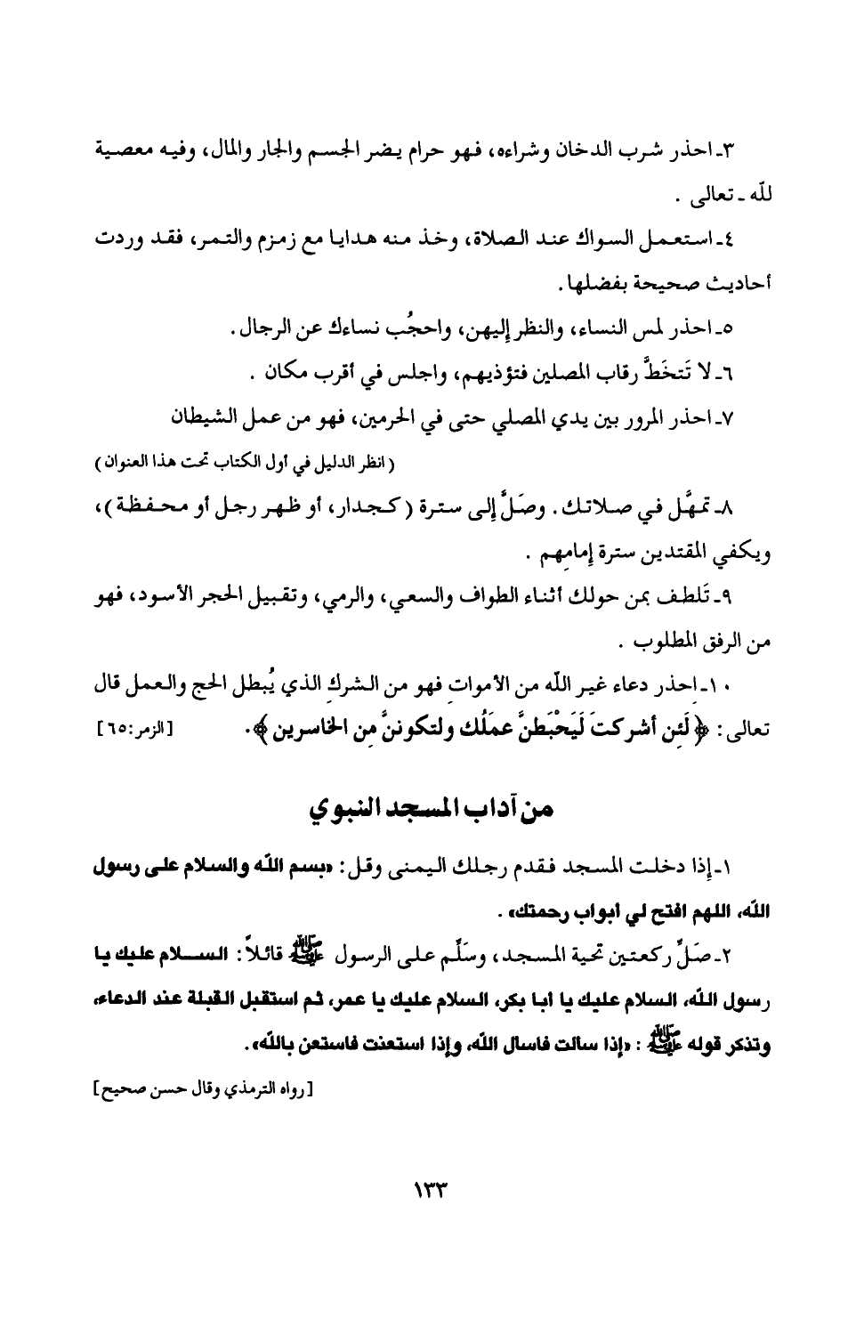 10 - احذر دعاء غير الله من الأموات فهو من الشركِ الذي يُبطل الحج والعمل قال تعالى: {ئِنْ أَشْرَكْتَ لَيَحْبَطَنَّ عَمَلُكَ وَلَتَكُونَنَّ مِنَ الْخَاسِرِينَ}. [الزمر: 65]