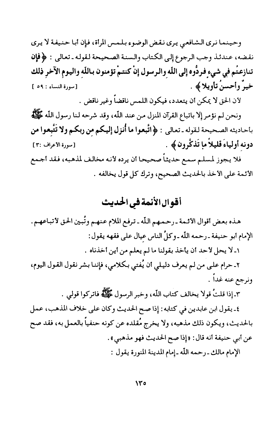 وحينما نرى الشافعي يرى نقض الوضوء بلمس المرأة، فإِن أبا حنيفة لا يرى نقضه، عندئذ وجب الرجوع إِلى الكتاب والسنة الصحيحة لقوله - تعالى: {فَإِنْ تَنَازَعْتُمْ فِي شَيْءٍ فَرُدُّوهُ إِلَى اللَّهِ وَالرَّسُولِ إِنْ كُنْتُمْ تُؤْمِنُونَ بِاللَّهِ وَالْيَوْمِ الْآخِرِ ذَلِكَ خَيْرٌ وَأَحْسَنُ تَأْوِيلًا}. [النساء: 59]