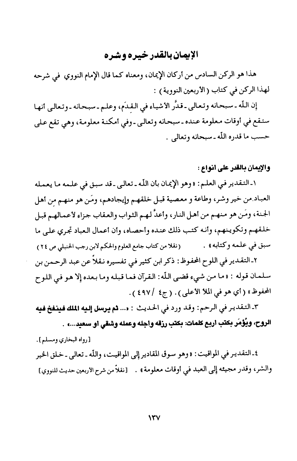 4 - التقدير في المواقيت: "وهو سوق المقادير إِلى المواقيت، والله -تعالى- خلق الخير والشر، وقدر مجيئه إِلى العبد في أوقات معلومة". [نقلاً من شرح الأربعين حديث للنووي]