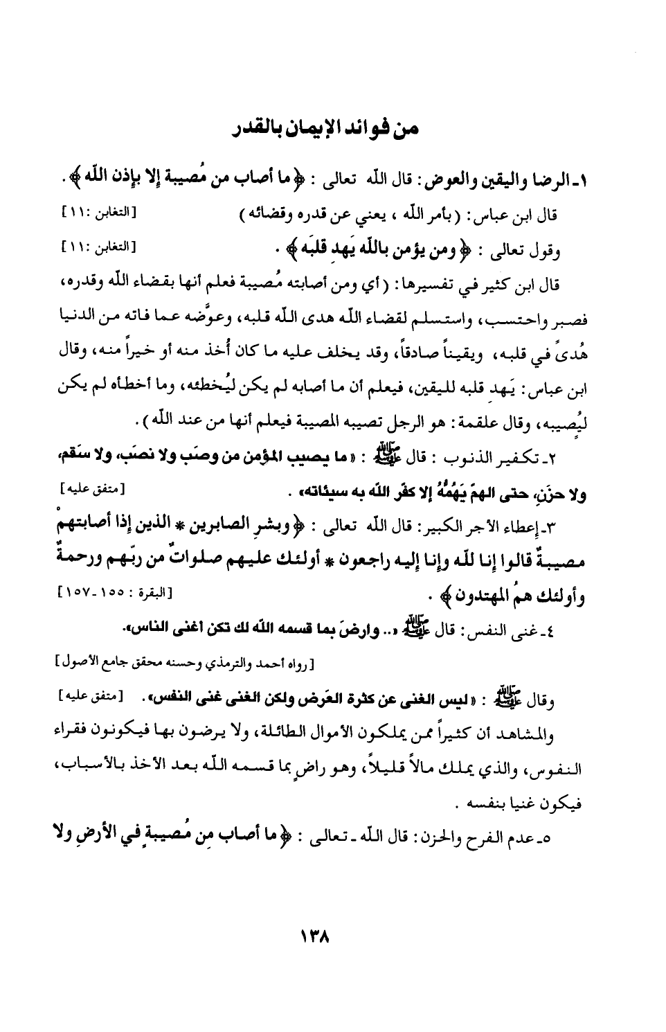 1 - الرضا واليقين والعوض: قال الله تعالى: {مَا أَصَابَ مِنْ مُصِيبَةٍ إِلَّا بِإِذْنِ اللَّهِ}. [التغابن: 11]
