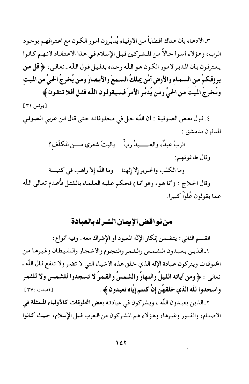 3 - الإدعاء بأن هناك أقطاباً من الأولياء يُدبِّرون أمور الكون مع اعترافهم بوجود الرب، وهؤلاء أسوأ حالاً من المشركين قبل الإِسلام في هذا الاعتقاد لأنهم كانوا يعترفون بأن المدبر لأمور الكون هو الله وحده بدليل قول الله - تعالى: {قُلْ مَنْ يَرْزُقُكُمْ مِنَ السَّمَاءِ وَالْأَرْضِ أَمَّنْ يَمْلِكُ السَّمْعَ وَالْأَبْصَارَ وَمَنْ يُخْرِجُ الْحَيَّ مِنَ الْمَيِّتِ وَيُخْرِجُ الْمَيِّتَ مِنَ الْحَيِّ وَمَنْ يُدَبِّرُ الْأَمْرَ فَسَيَقُولُونَ اللَّهُ فَقُلْ أَفَلَا تَتَّقُونَ}. [يونس: 31]