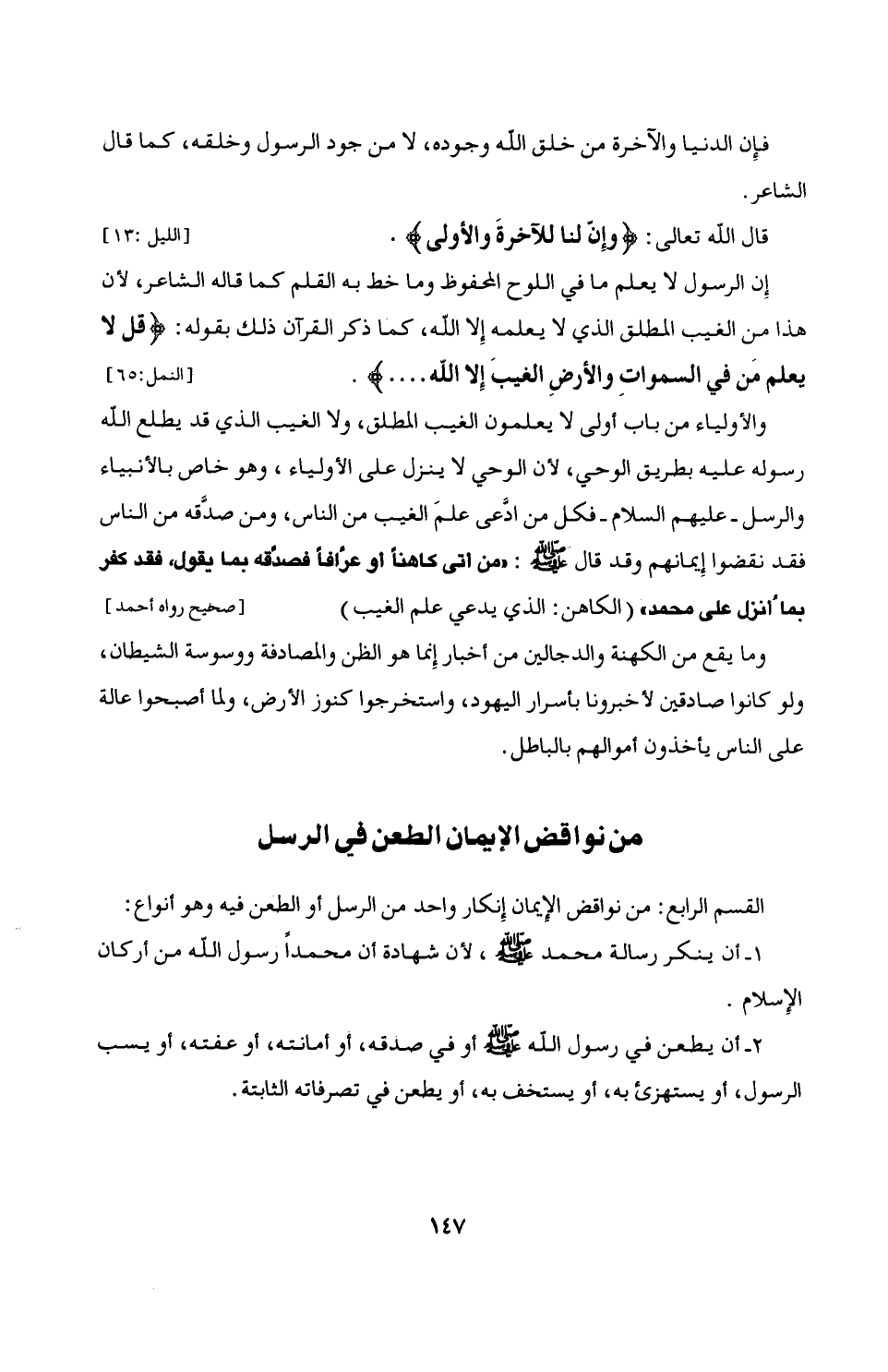 القسم الرابع: من نواقض الإيمان إِنكار واحد من الرسل أو الطعن فيه وهو أنواع: