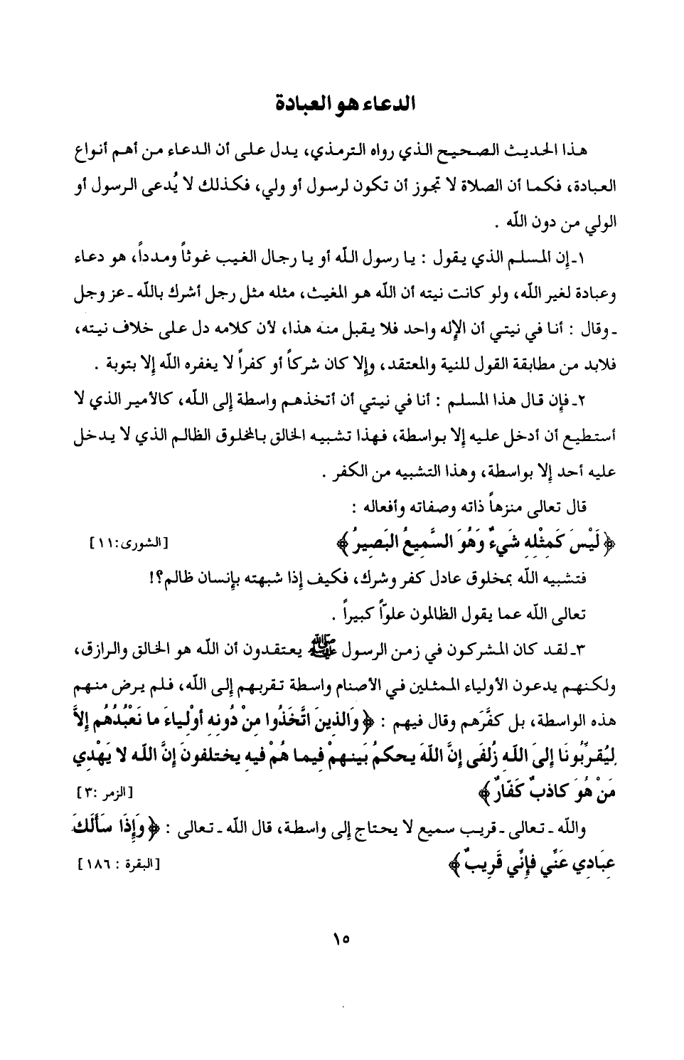 هذا الحديث الصحيح الذي رواه الترمذي، يدل على أن الدعاء من أهم أنواع العبادة، فكما أن الصلاة لا تجوز أن تكون لرسول أو ولي، فكذلك لا يُدعى الرسول أو الولي من دون الله.