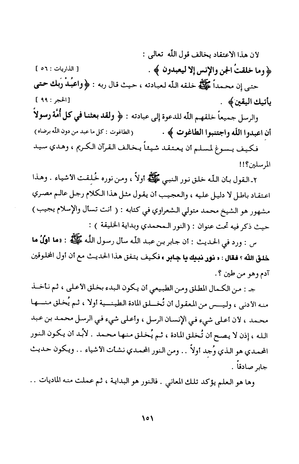 جـ: من الكمال المطلق ومن الطبيعي أن يكون البدء بخلق الأعلى، ثم نأخذ منه الأدنى، وليس من المعقول أن تُخلق المادة الطينية أولا، ثم يُخلق منها محمد، لأن أعلى شيء في الإِنسان الرسل، وأعلى شيء في الرسل محمد بن عبد الله، إِذن لا يصح أن تخلق المادة، ثم يُخلق منها محمد. لابُد أن يكون النور المحمدي هو الذي وُجِد أولًا .. ومن النور المحمدي نشأت الأشياء .. ويكون حديث جابر صادقًا.