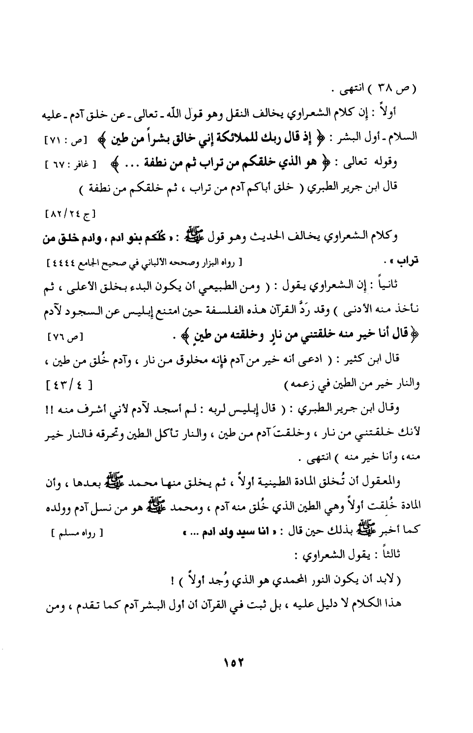 وكلام الشعراوي لِخالف الحديث وهو قول - صلى الله عليه وسلم -: "كلكم بنو آدم، وآدم خلق من تراب". [رواه البزار وصححه الألباني في صحيح الجامع 4444]