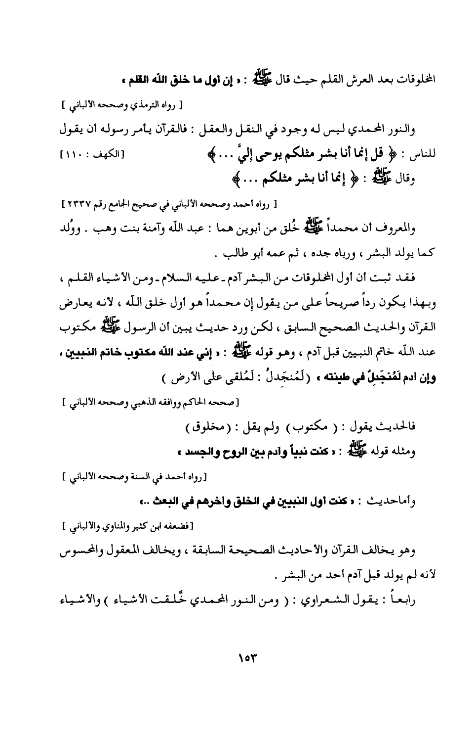 والنور المحمدي ليس له وجود في النقل والعقل: فالقرآن يأمر رسوله أن يقول للناس: {قل إِنما أنا بشر مثلكم يوحى إليَّ ...} [الكهف: 110]