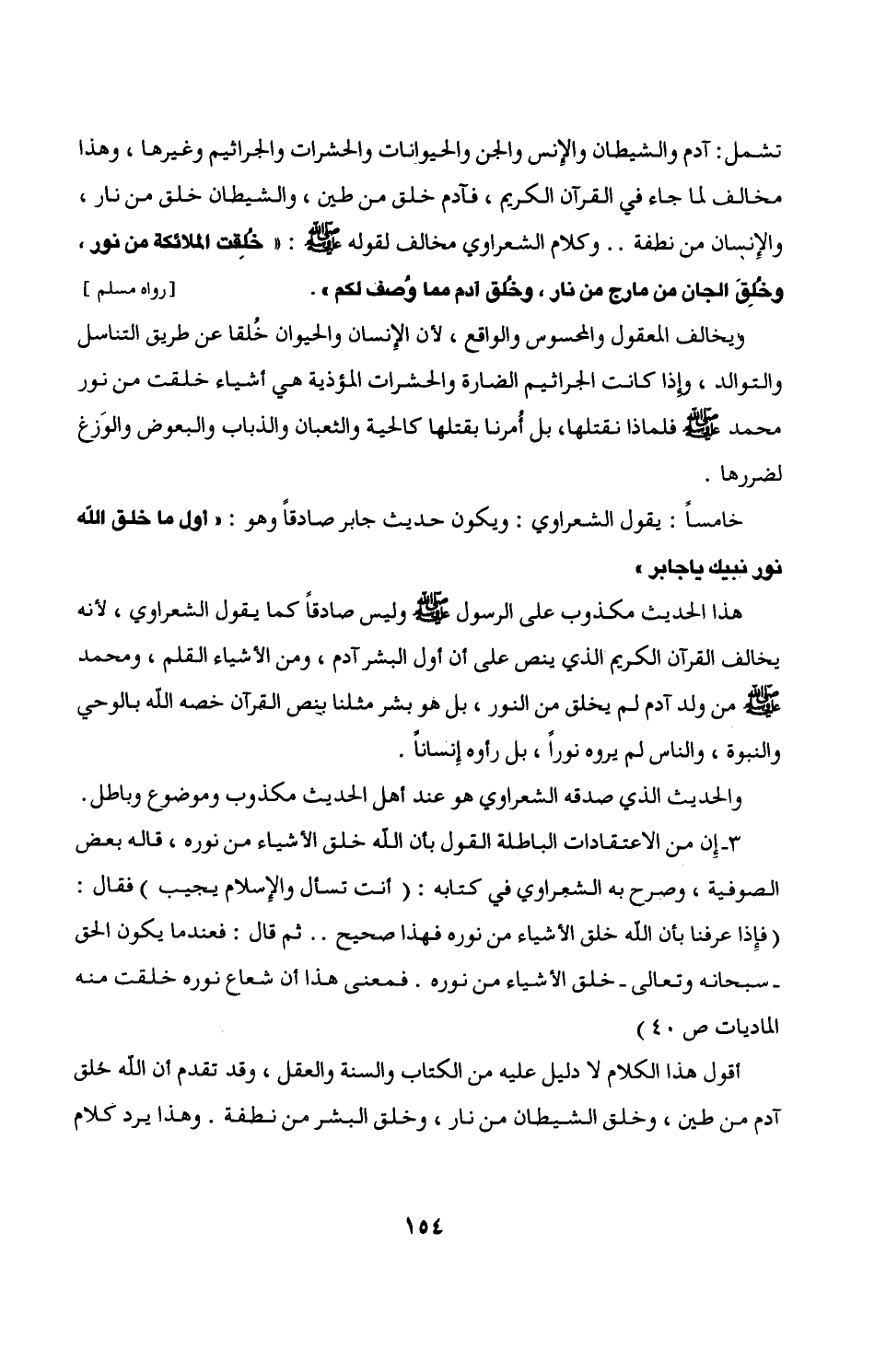 هذا الحديث مكذوب على الرسول - صلى الله عليه وسلم - وليس صادقًا كما يقول الشعراوي، لأنه يخالف القرآن الكريم الذى ينص على أن أول البشر آدم، ومن الأشياء القلم، ومحمد - صلى الله عليه وسلم - من ولد آدم لم يخلق من النور، بل هو بشر مثلنا بنص القرآن خصه الله بالوحي والنبوة، والناس لم يروه نورًا، بل رأوه إِنسانًا.
