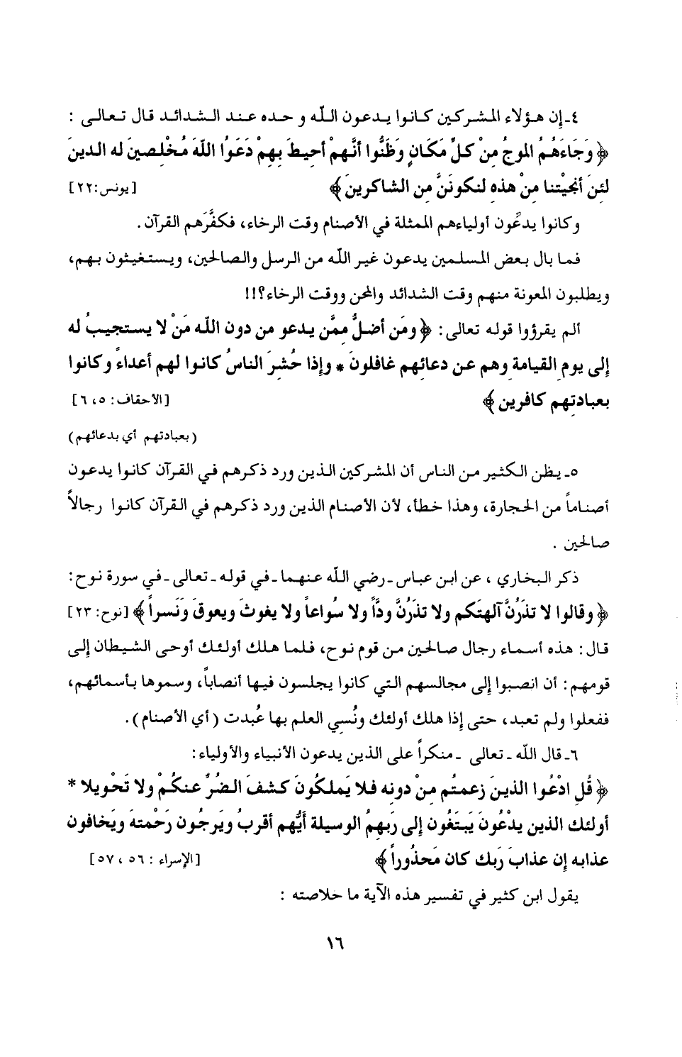 6 - قال الله -تعالى- منكرًا على الذين يدعون الأنبياء والأولياء: {قُلِ ادْعُوا الَّذِينَ زَعَمْتُمْ مِنْ دُونِهِ فَلَا يَمْلِكُونَ كَشْفَ الضُّرِّ عَنْكُمْ وَلَا تَحْوِيلًا (56) أُولَئِكَ الَّذِينَ يَدْعُونَ يَبْتَغُونَ إِلَى رَبِّهِمُ الْوَسِيلَةَ أَيُّهُمْ أَقْرَبُ وَيَرْجُونَ رَحْمَتَهُ وَيَخَافُونَ عَذَابَهُ إِنَّ عَذَابَ رَبِّكَ كَانَ مَحْذُورًا} [الإسراء: 56، 57]