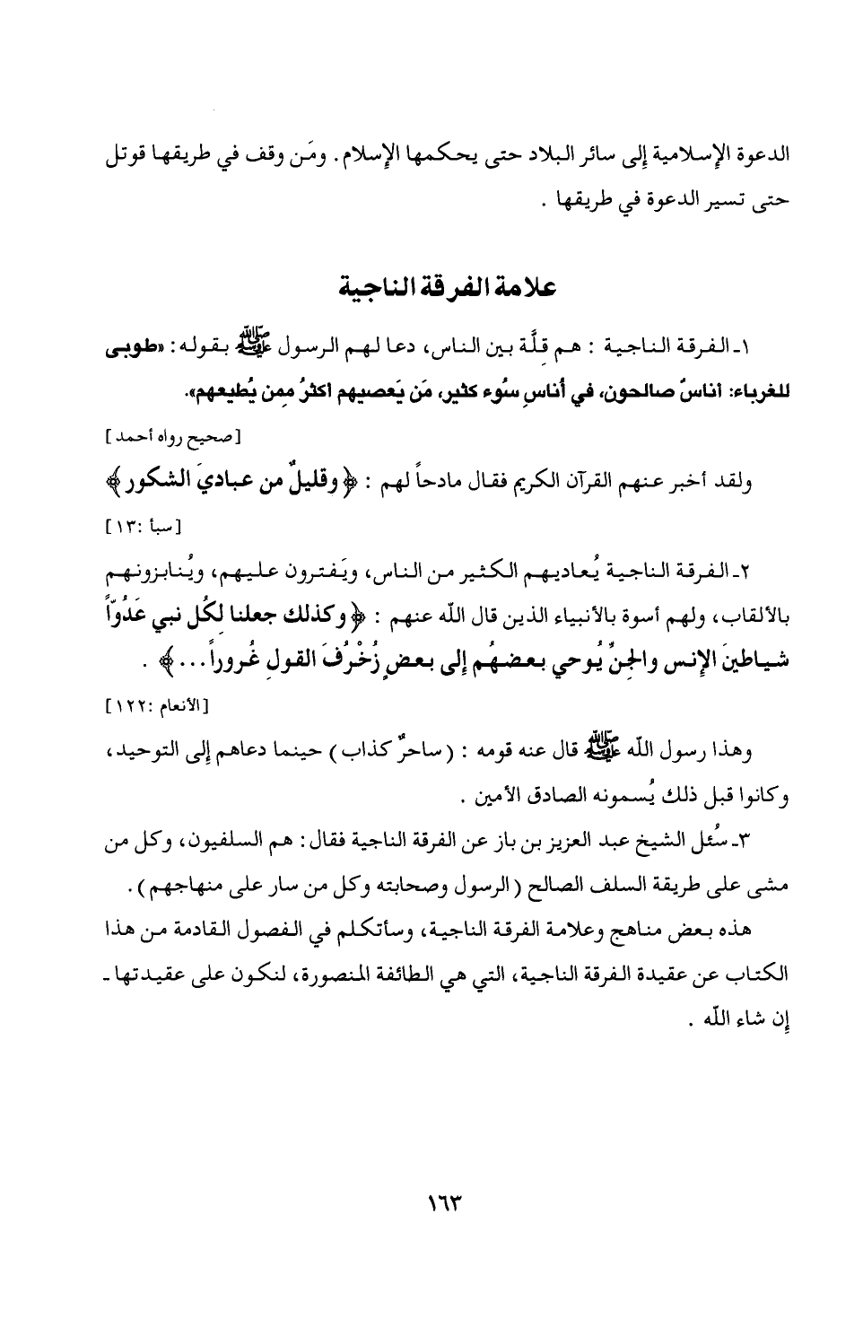 3 - سُئل الشيخ عبد العزيز بن باز عن الفرقة الناجية فقال: هم السلفيون، وكل من مشى على طريقة السلف الصالح (الرسول وصحابته وكل من سار على منهاجهم).