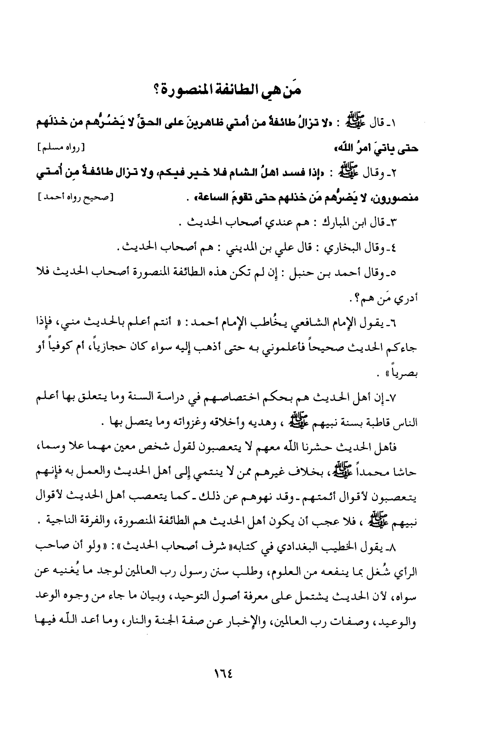 5 - وقال أحمد بن حنبل: إِن لم تكن هذه الطائفة المنصورة أصحاب الحديث فلا أدري مَن هم؟.