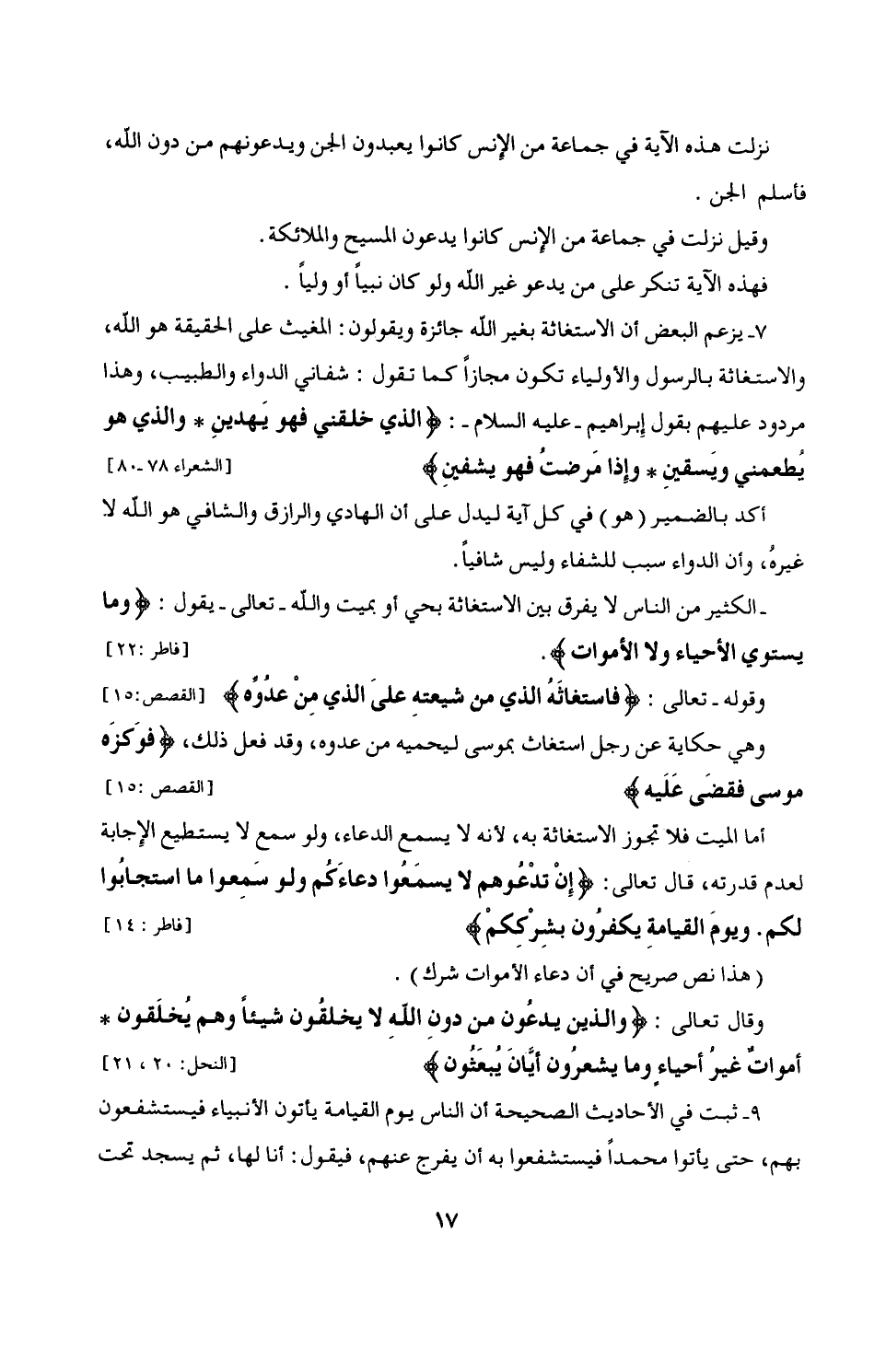 7 - يزعم البعض أن الاستغاثة بغير الله جائزة ويقولون: المغيث على الحقيقة هو الله، والاستغاثة بالرسول والأولياء تكون مجازًا كما تقول: شفاني الدواء والطبيب، وهذا مردود عليهم بقول إِبراهيم -عليه السلام-: {الَّذِي خَلَقَنِي فَهُوَ يَهْدِينِ (78) وَالَّذِي هُوَ يُطْعِمُنِي وَيَسْقِينِ (79) وَإِذَا مَرِضْتُ فَهُوَ يَشْفِينِ} [الشعراء: 78 - 80]