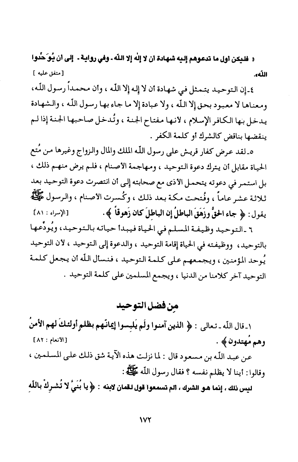 "فليكن أول ما تدعوهم إليه شهادة ان لا إله إلا الله. وفي رواية - إلى أن يُوَحِّدوا الله". [متفق عليه]
