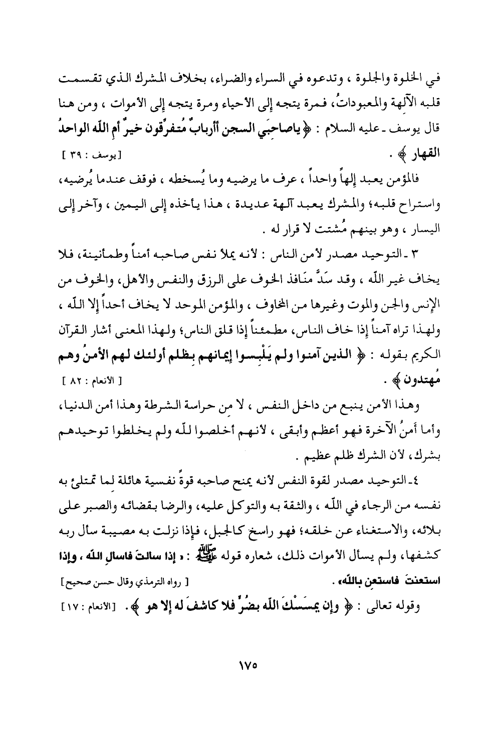 4 - التوحيد مصدر لقوة النفس لأنه يمنح صاحبه قوةً نفسية هائلة لِما تمتلئ به نفسه من الرجاء في الله، والثقة به والتوكل عليه، والرضا بقضائه والصبر على بلائه، والاستغناء عن خلقه؛ فهو راسخ كالجبل، فإِذا نزلت به مصيبة سأل ربه كشفها، ولم يسأل الأموات ذلك، شعاره قوله - صلى الله عليه وسلم -:"إذا سألت فاسألِ الله، وإذا استعنتَ فاستعِن بالله". [رواه الترمذي وقال حسن صحيح]