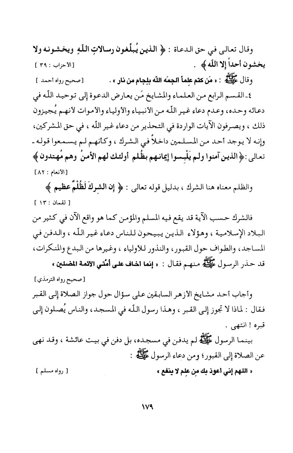 4 - القسم الرابع من العلماء والمشايخ مَن يعارض الدعوة إِلى توحيد الله في دعائه وحده، وعدم دعاء غير الله من الأنبياء والأولياء والأموات لأنهم يُجيزون ذلك، ويصرفون الآيات الواردة في التحذير من دعاء غير الله، في حق المشركين، وإِنه لا يوجد أحد من السلمين داخلًا في الشرك، وكأنهم لم يسمعوا قوله - تعالى: {الذين آمنوا ولم يَلْبِسوا إِيمانهم بظُلم أولئك لهم الأمن وهم مُهتدون} [الأنعام: 82]