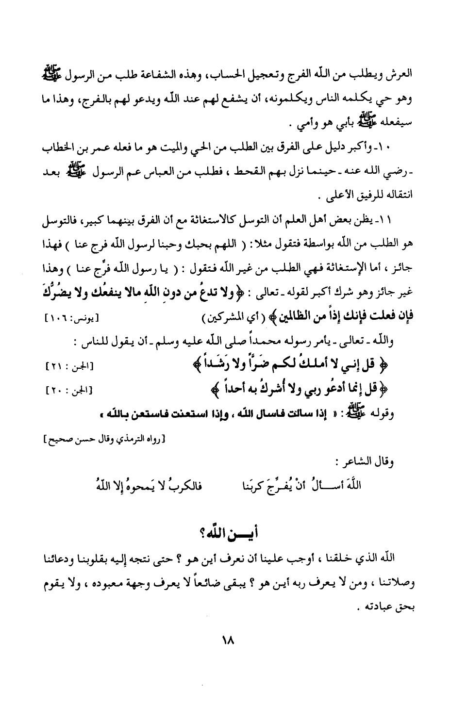 11 - يظن بعض أهل العلم أن التوسل كالاستغاثة مع أن الفرق بينهما كبير، فالتوسل هو الطلب من الله بواسطة فتقول مثلا: (اللهم بحبك وحبنا لرسول الله فرج عنا) فهذا جائز، أما الإستغاثة فهي الطلب من غير الله فتقول: (يا رسول الله فرِّج عنا) وهذا غير جائز وهو شرك أكبر لقوله - تعالى: {وَلَا تَدْعُ مِنْ دُونِ اللَّهِ مَا لَا يَنْفَعُكَ وَلَا يَضُرُّكَ فَإِنْ فَعَلْتَ فَإِنَّكَ إِذًا مِنَ الظَّالِمِينَ} (أي المشركين) [يونس: 106]