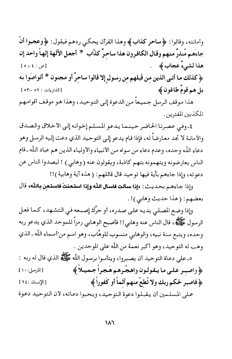 4 - وفي عصرنا الحاضر حينما يدعو المسلم إِخوانه إِلى الأخلاق والصدق والأمانة لا تجد معارضًا له، فإِذا قام يدعو إِلى التوحيد الذي دعت إِليه الرسل وهو دعاء الله وحده، وعدم دعاء من سواه من الأنبياء والأولياء الذين هم عباد الله - قام الناس يعارضونه ويتهمونه بتهم كاذبة، ويقولون عنه (وهابي)! ليصدوا الناس عن دعوته، وإِذا جاءهم بآية فيها توحيد قال قائلهم: (هذه آية وهابية)!!
