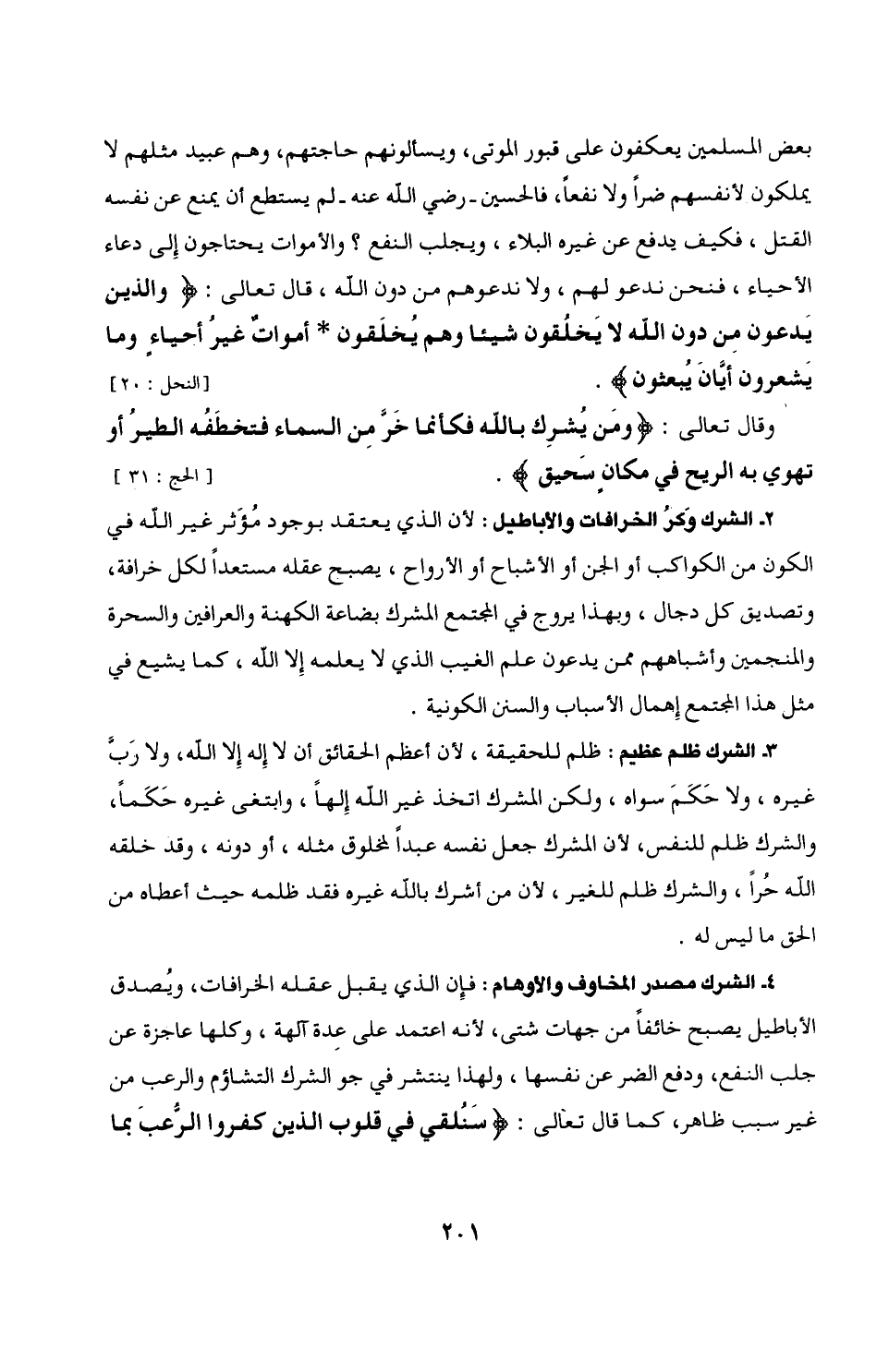 3 - الشرك ظلم عظيم: ظلم للحقيقة، لأن أعظم الحقائق أن لا إِله إِلا الله، ولا رَبَّ غيره، ولا حَكَمَ سواه، ولكن المشرك اتخذ غير الله إِلهًا، وابتغى غيره حَكَمًا، والشرك ظلم للنفس، لأن المشرك جعل نفسه عبدًا لخلوق مثله، أو دونه، وقد خلقه الله حُرًا، والشرك ظلم للغير، لأن من أشرك بالله غيره فقد ظلمه حيث أعطاه من الحق ما ليس له.