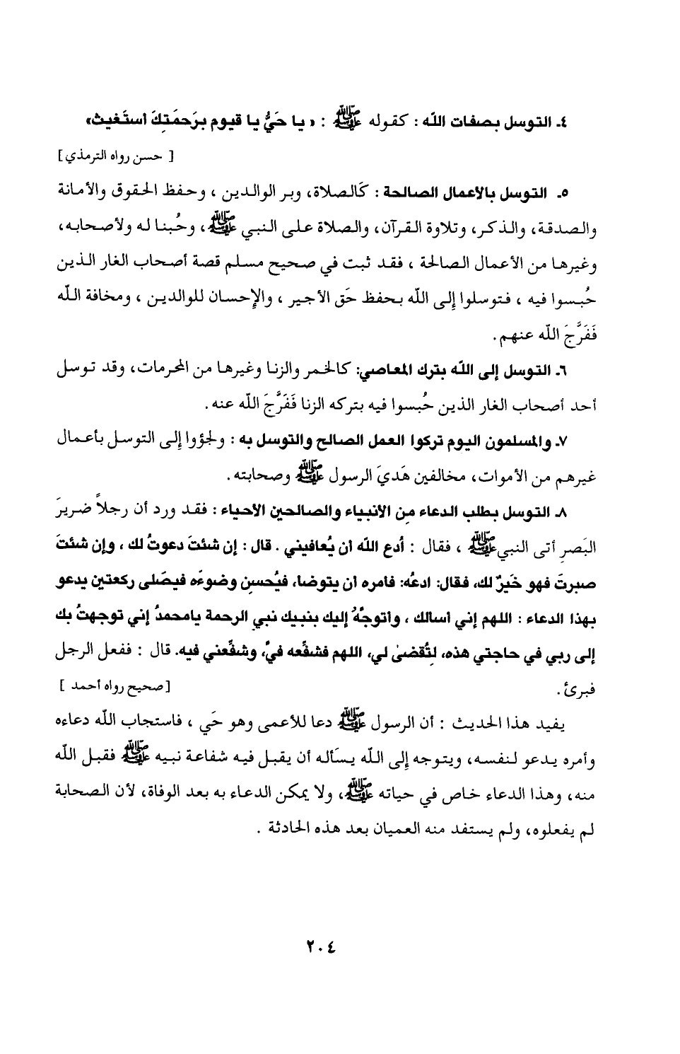 8 - التوسل بطلب الدُّعاء مِن الأنبياء والصالحين الأحياء: فقد ورد أن رجلًا ضريرَ البَصرِ آتى النبي - صلى الله عليه وسلم -، فقال: ادعُ الله أن يُعافيني. قال: إن شئتَ دعوتُ لك، وإن شئتَ صبرتَ فهو خَيرٌ لك، فقال: ادعُه: فأمره أن يتوضأ، فيُحسِن وضوئه فيصَلي ركعتين يدعو بهذا الدُّعاء: اللهم إني أسالك، وأتوجَّهُ إليك بنبيك نبي الرحمة يا محمدُ إني توجهتُ بك إلى ربي في حاجتي هذه، لِتُقضى لي، اللهم فشفِّعه فيَّ، وشفِّعني فيه. قال: ففعل الرجل
