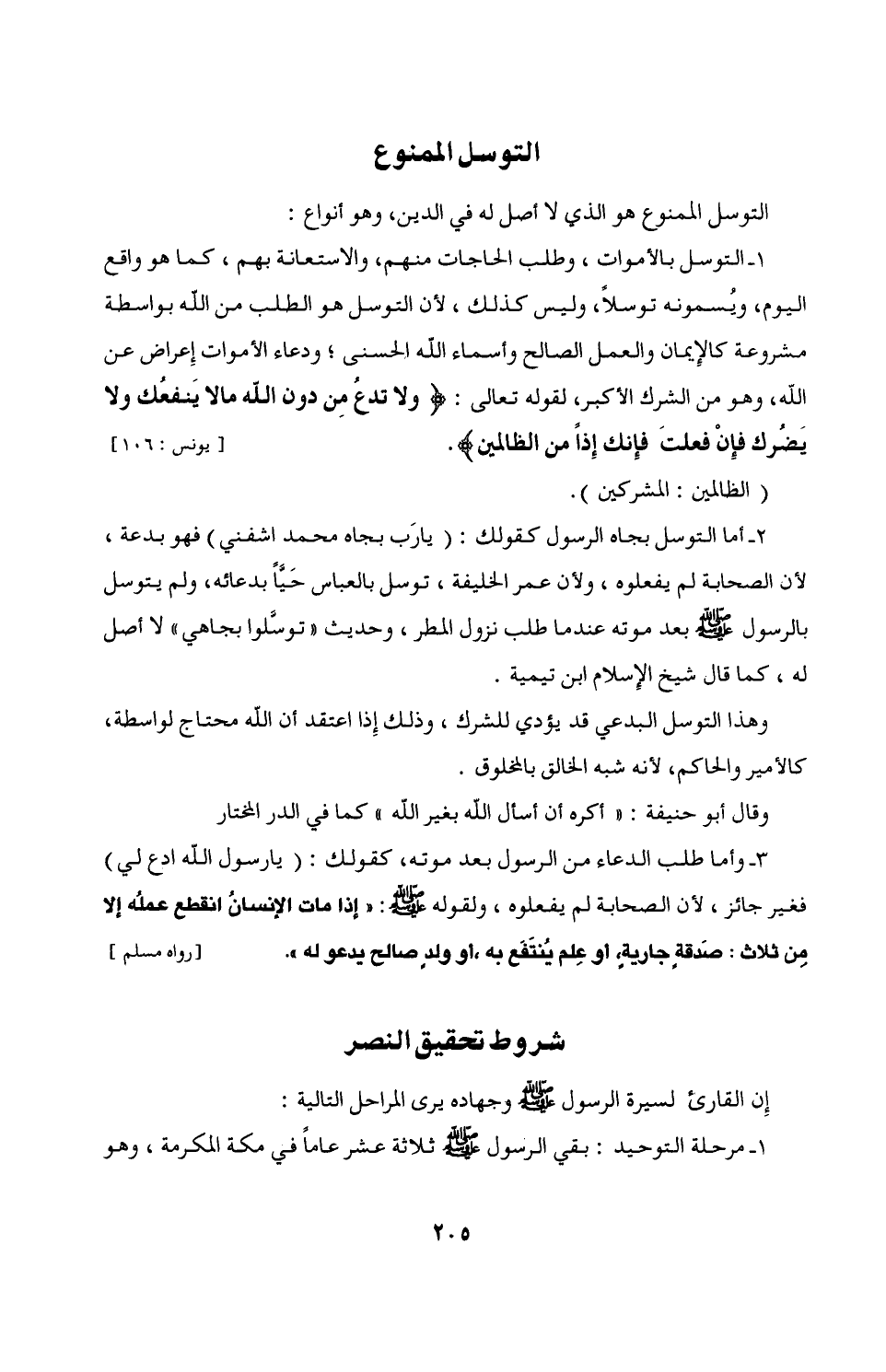 مشروعة كالإِيمان والعمل الصالح وأسماء الله الحسنى؛ ودعاء الأموات إِعراض عن الله، وهو من الشرك الأكبر، لقوله تعالى: {وَلَا تَدْعُ مِنْ دُونِ اللَّهِ مَا لَا يَنْفَعُكَ وَلَا يَضُرُّكَ فَإِنْ فَعَلْتَ فَإِنَّكَ إِذًا مِنَ الظَّالِمِينَ} [يونس: 106]. (الظالمين: المشركين).