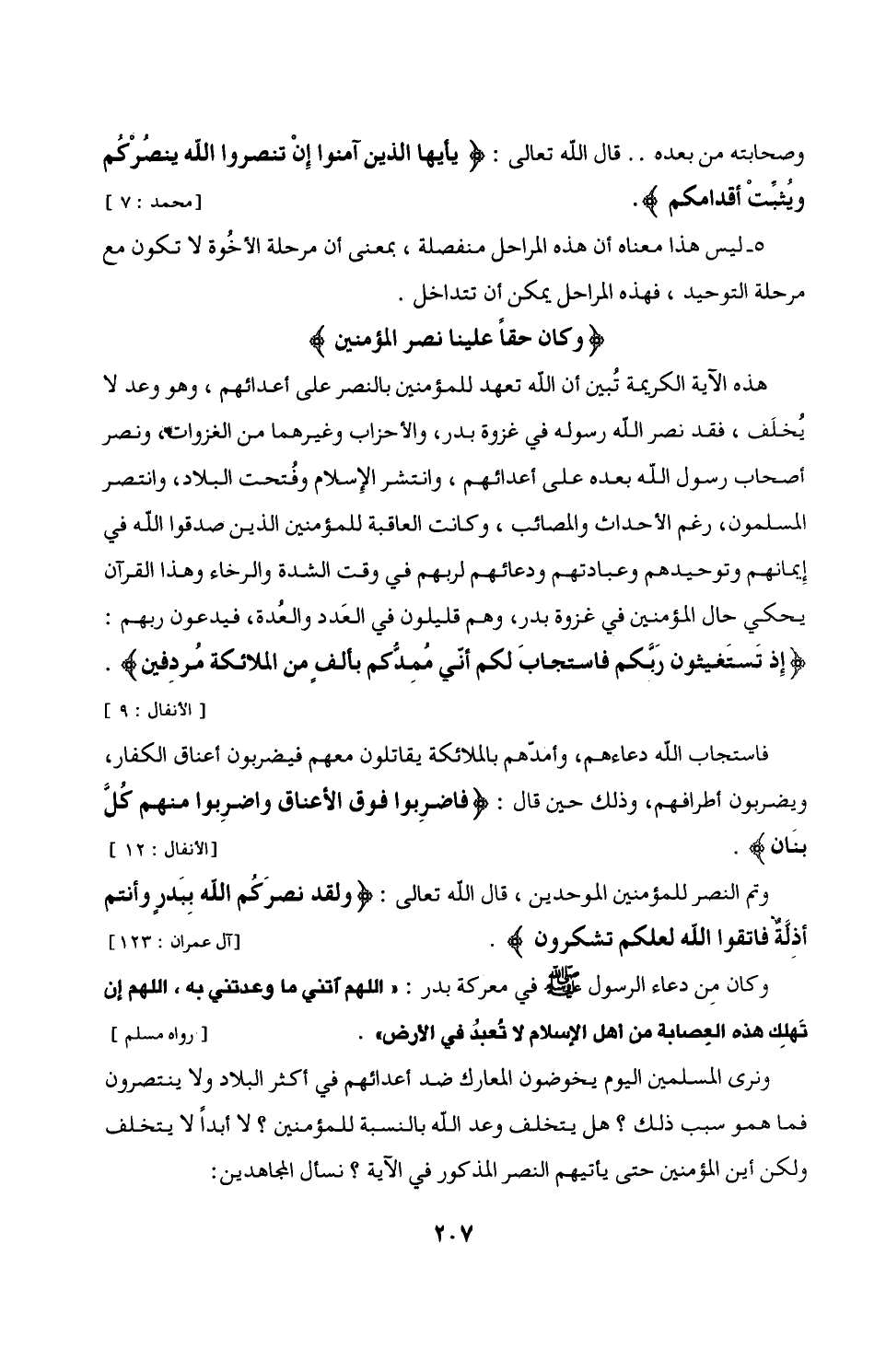وكان مِن دعاء الرسول - صلى الله عليه وسلم - في معركة بدر: "اللَّهُمَّ آتني ما وعدتني به، اللَّهُمَّ إن تَهلِك هذه العِصابة من أهل الإسلام لا تُعبدُ في الأرض" [رواه مسلم]