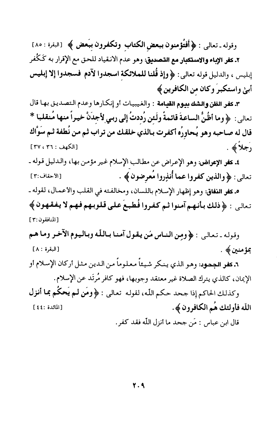 5 - كفر النفاق: وهو إِظهار الإسلام باللسان، ومخالفته في القلب والأعمال، لقوله - تعالى: {ذَلِكَ بِأَنَّهُمْ آمَنُوا ثُمَّ كَفَرُوا فَطُبِعَ عَلَى قُلُوبِهِمْ فَهُمْ لَا يَفْقَهُونَ} [المنافقون: 3]