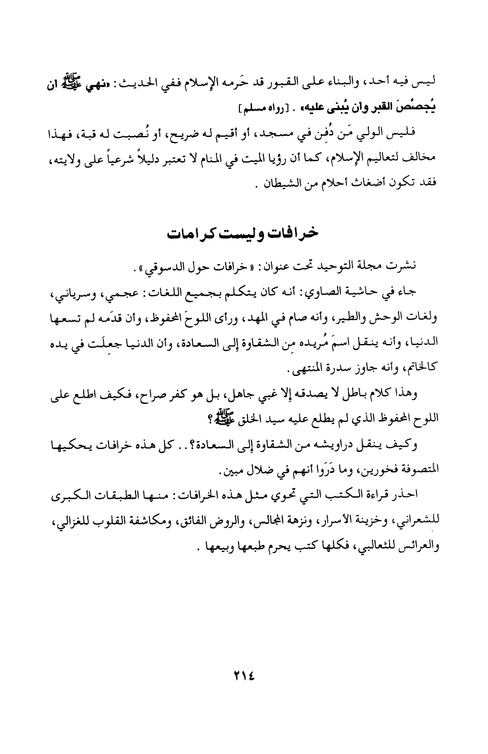 احذر قراءة الكتب التي تحوي مثل هذه الخرافات: منها الطبقات الكبرى للشعراني، وخزينة الأسرار، ونزهة المجالس، والروض الفائق، ومكاشفة القلوب للغزالي، والعرائس للثعالبي، فكلها كتب يحرم طبعها وبيعها.