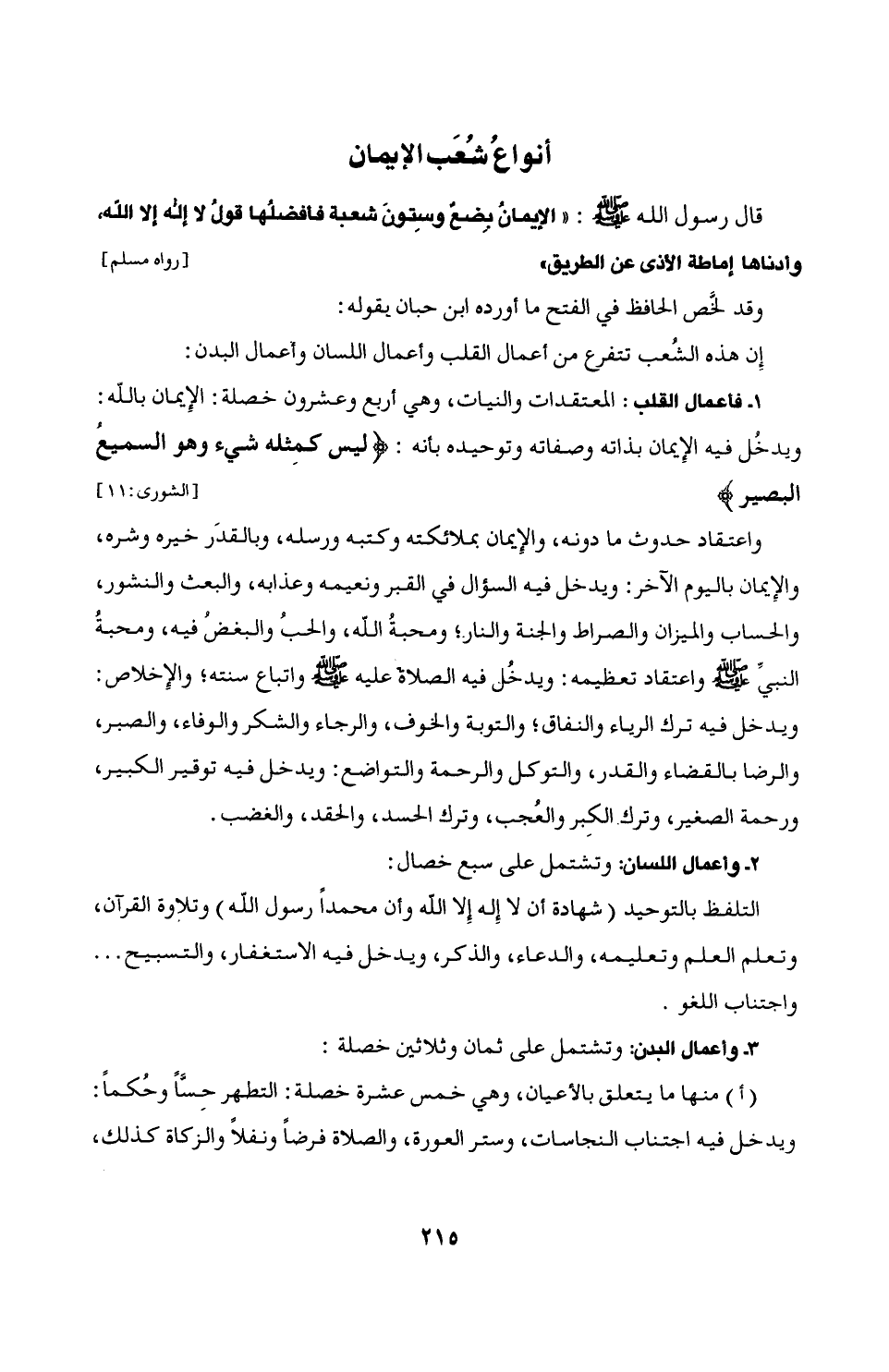 إِن هذه الشُعب تتفرع من أعمال القلب وأعمال اللسان وأعمال البدن: