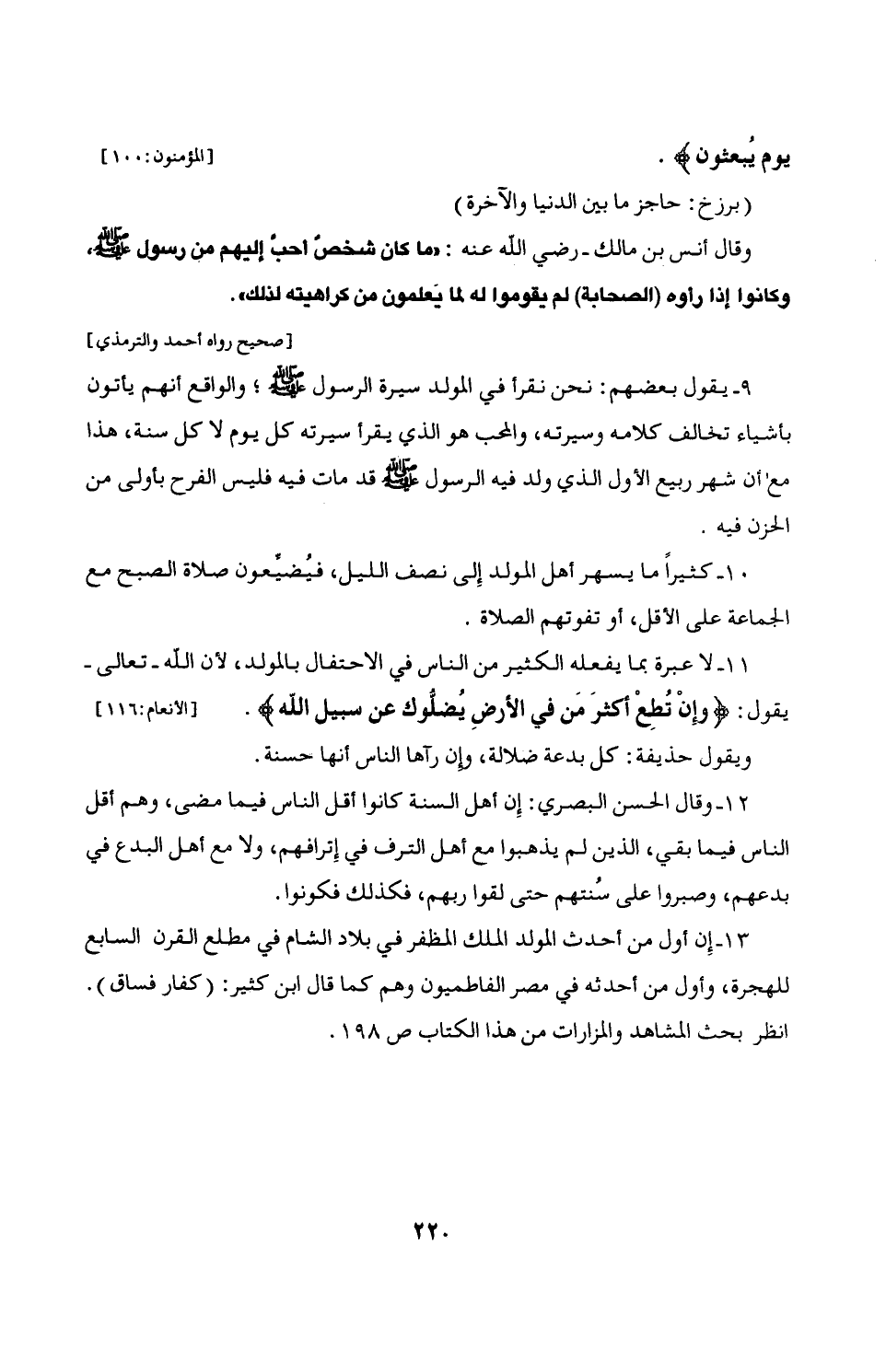 11 - لا عبرة بما يفعله الكثير من الناس في الإحتفال بالمولد، لأن الله -تعالى- يقول: {وَإِنْ تُطِعْ أَكْثَرَ مَنْ فِي الْأَرْضِ يُضِلُّوكَ عَنْ سَبِيلِ اللَّهِ} [الأنعام: 116]
