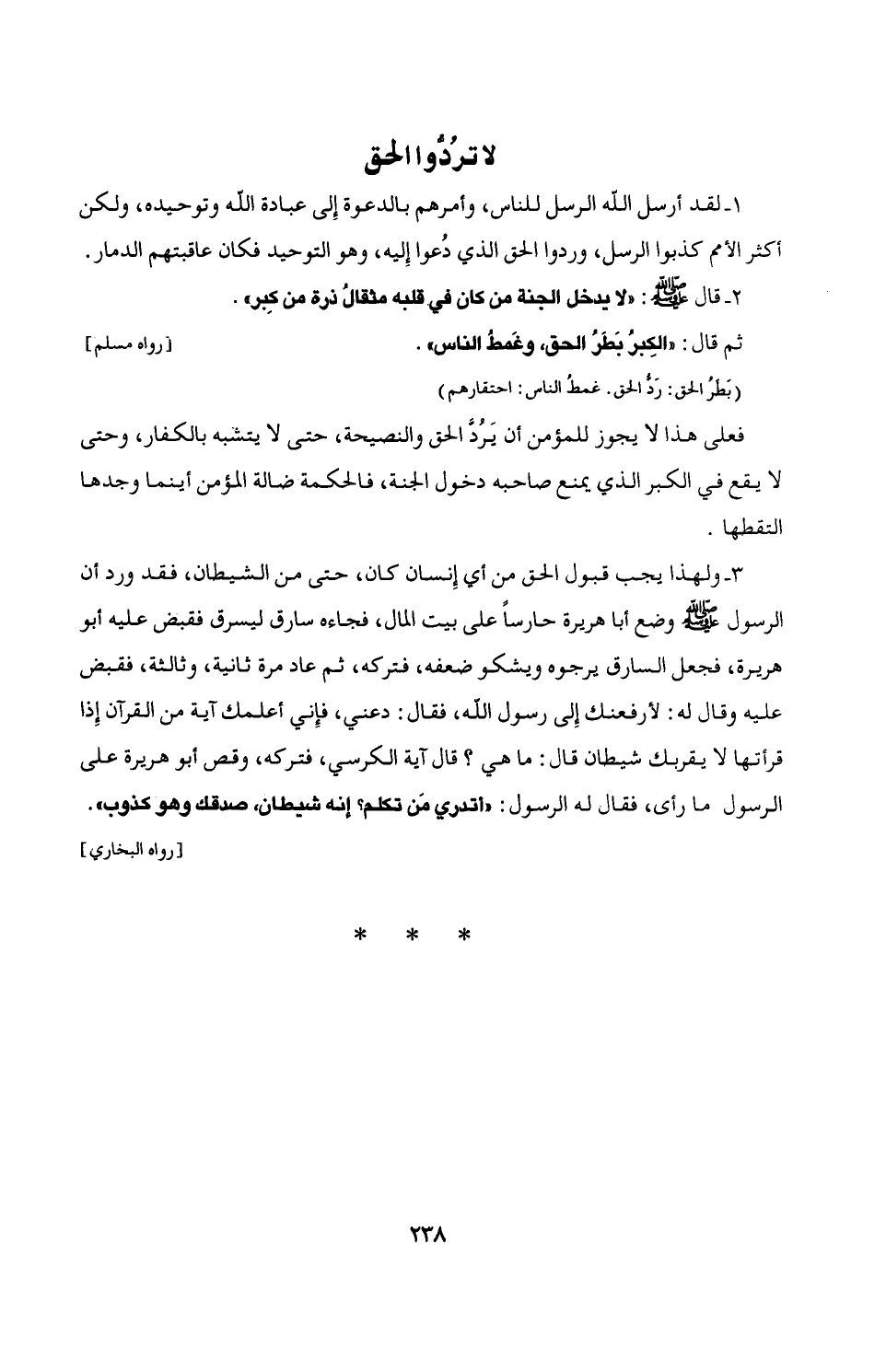 3 - ولهذا يجب قبول الحق من أى إِنسان كان، حتى من الشيطان، فقد ورد أن الرسول - صلى الله عليه وسلم - وضع أبا هريرة حارسًا على بيت المال، فجاءه سارق ليسرق فقبض عليه أبو هريرة، فجعل السارق يرجوه ويشكو ضعفه، فتركه، ثم عاد مرة ثانية، وثالثة، فقبض عليه وقال له: لأرفعنك إِلى رسول الله، فقال: دعني، فإِني أعلمك آية من القرآن إِذا قرأتها لا يقربك شيطان قال: ما هي؟ قال آية الكرسي، فتركه، وقص أبو هريرة على الرسول ما رأى، فقال له الرسول: "أتدري مَن تكلم؟ إنه شيطان، صدقك وهو كذوب". [رواه البخاري]