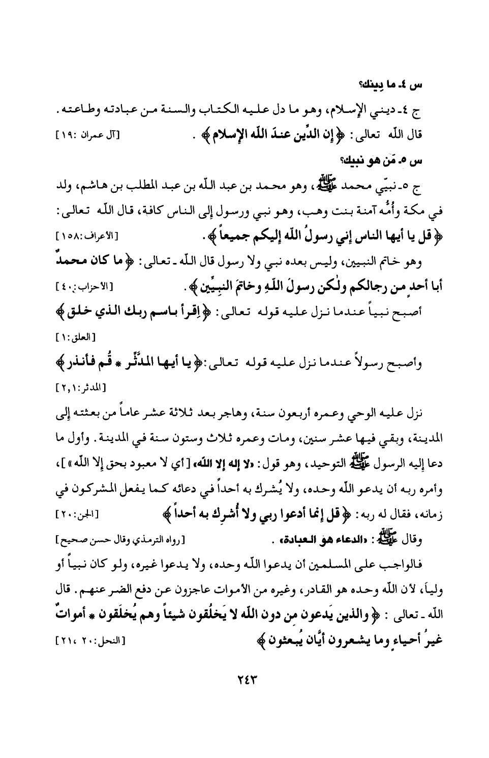المدينة، وبقي فيها عشر سنين، ومات وعمره ثلاث وستون سنة في المدينة. وأول ما دعا إِليه الرسول - صلى الله عليه وسلم - التوحيد، وهو قول: "لا إله إِلا الله، [أي لا معبود بحق إِلا الله"]، وأمره ربه أن يدعو الله وحده، ولا يُشرك به أحدًا في دعائه كما يفعل المشركون في زمانه، فقال له ربه: {قُلْ إِنَّمَا أَدْعُو رَبِّي وَلَا أُشْرِكُ بِهِ أَحَدًا} [الجن: 20]