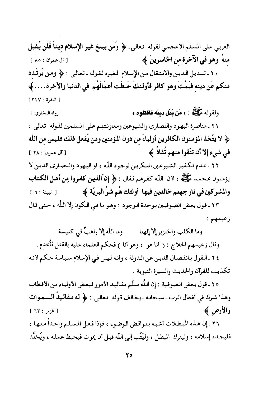 20 - تبديل الدين والانتقال من الإِسلام لغيره لقوله - تعالى: {وَمَنْ يَرْتَدِدْ مِنْكُمْ عَنْ دِينِهِ فَيَمُتْ وَهُوَ كَافِرٌ فَأُولَئِكَ حَبِطَتْ أَعْمَالُهُمْ فِي الدُّنْيَا وَالْآخِرَةِ} [البقرة: 217] ولقوله - صلى الله عليه وسلم -: "من بَدَّل دينه فاقتلوه" [رواه البخاري]