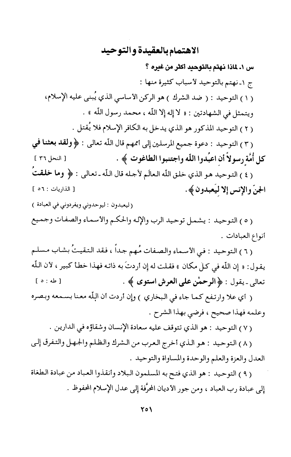 (3) التوحيد: دعوة جميع المرسلين إِلى أممهم قال الله تعالى: {وَلَقَدْ بَعَثْنَا فِي كُلِّ أُمَّةٍ رَسُولًا أَنِ اعْبُدُوا اللَّهَ وَاجْتَنِبُوا الطَّاغُوتَ}. [النحل 36]