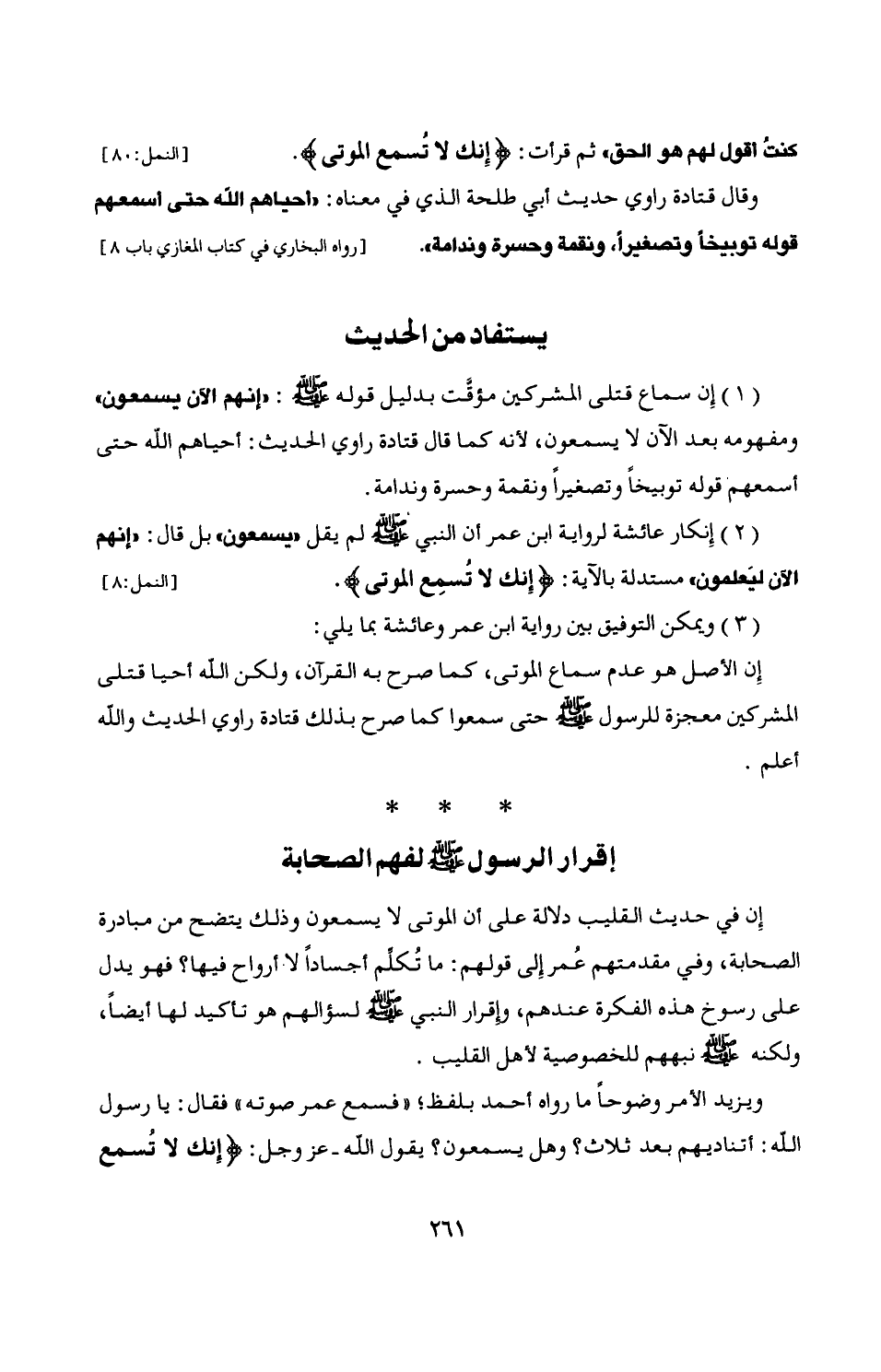 إِن الأصل هو عدم سماع الموتى، كما صرح به القرآن، ولكن الله أحيا قتلى