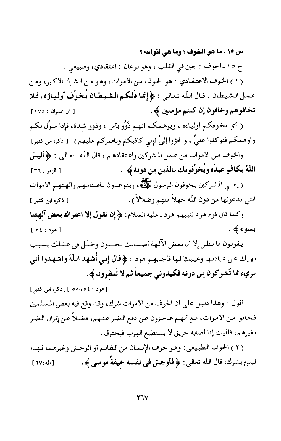 (2) الخوف الطبيعي: وهو خوف الإِنسان من الظالم أو الوحش وغيرهما فهذا ليس بشرك، قال الله تعالى: {فَأَوْجَسَ فِي نَفْسِهِ خِيفَةً مُوسَى}. [طه:67]