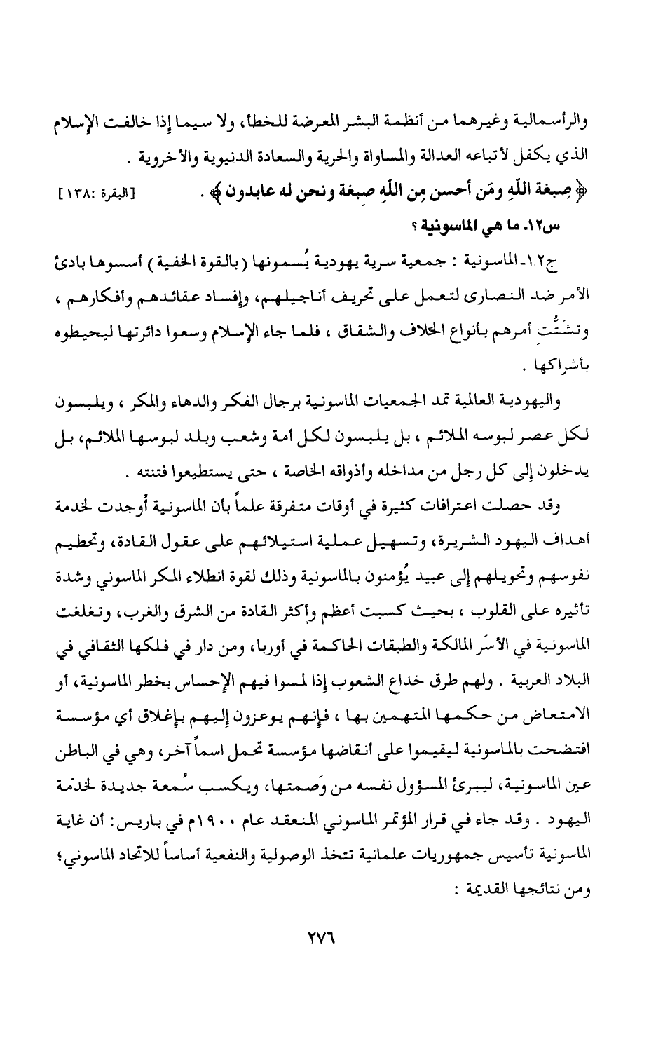 ج 12 - الماسونية: جمعية سرية يهودية يُسمونها (بالقوة الخفية) أسسوها بادئ الأمر ضد النصارى لتعمل على تحريف أناجيلهم، وإفساد عقائدهم وأفكارهم، وتشَتُّتِ أمرهم بأنواع الخلاف والشقاق، فلما جاء الإِسلام وسعوا دائرتها ليحيطوه بأشراكها.